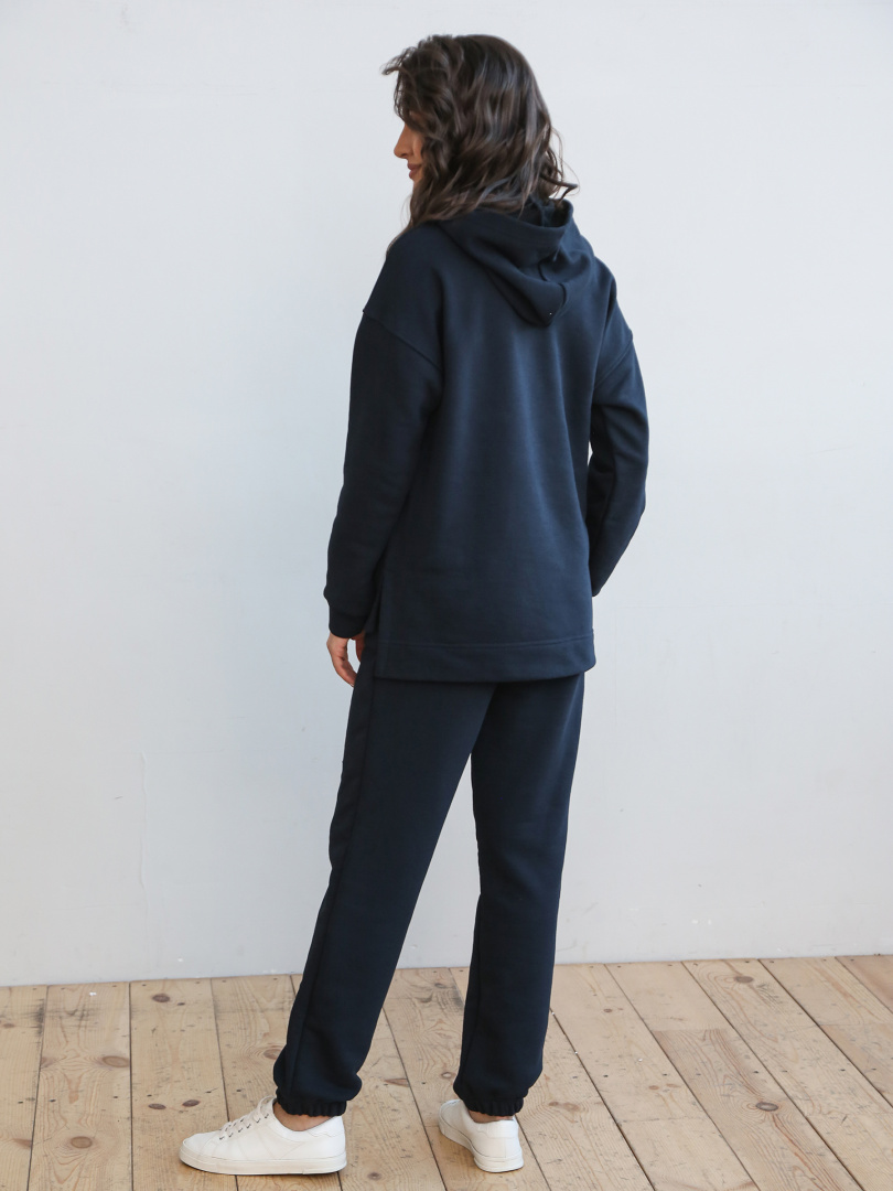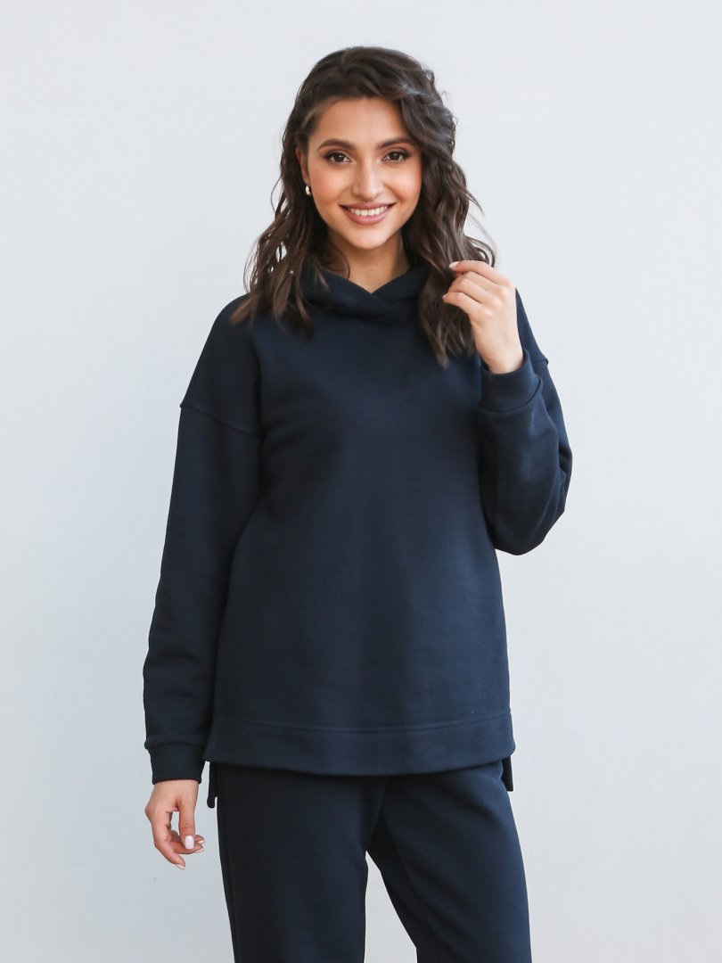 Джемпер средней длины с капюшоном, выполнен из плотного трикотажа. Покрой свободный, рукав со спущенным плечом. Низ боковых швов – разрезы. Низ рукавов – манжеты.