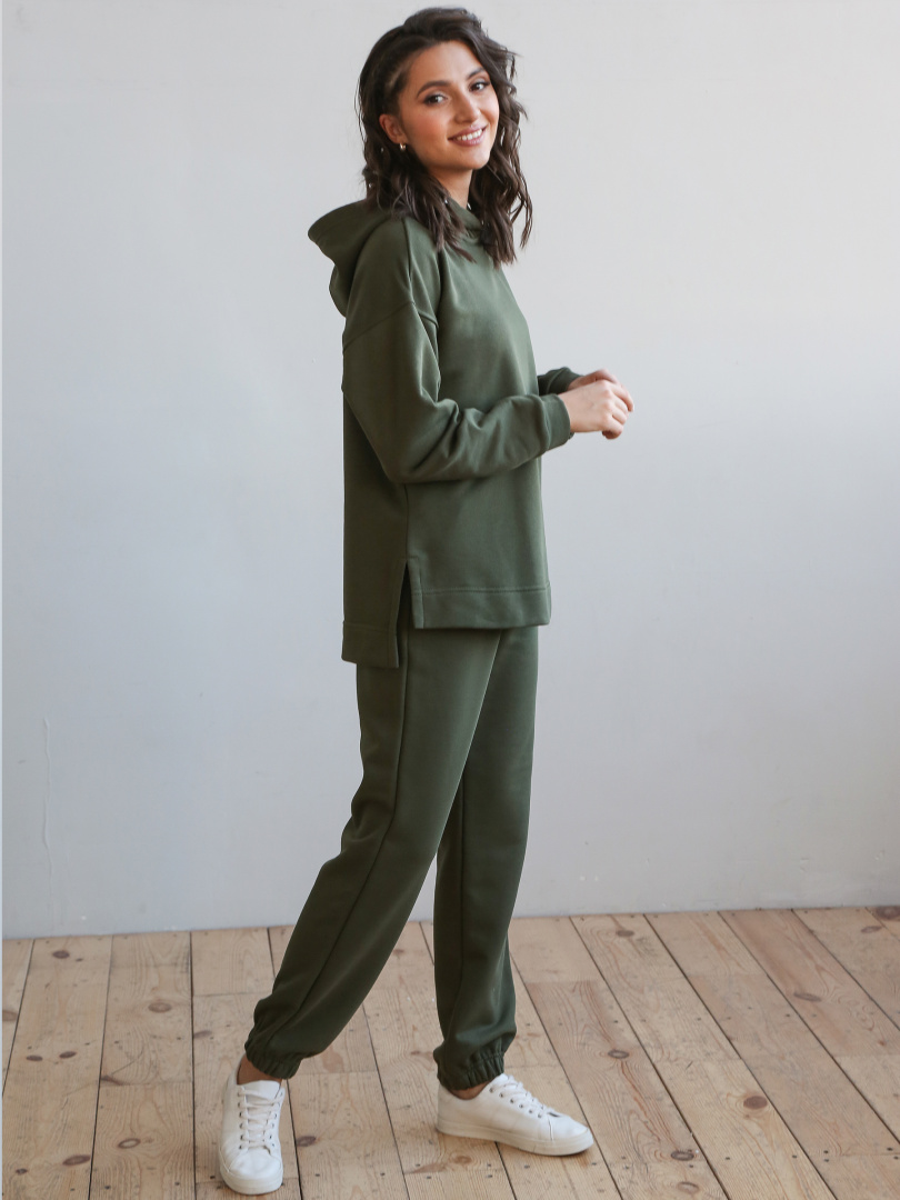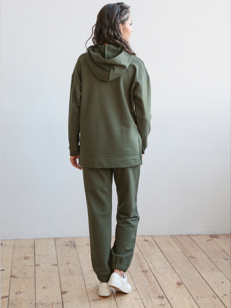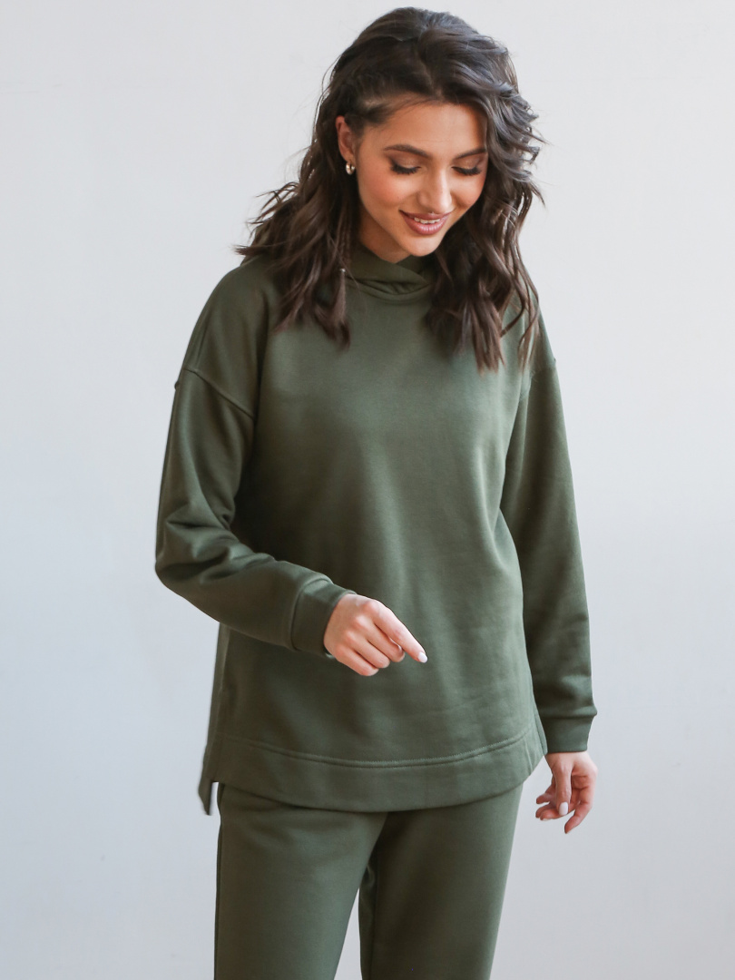 Джемпер средней длины с капюшоном, выполнен из плотного трикотажа. Покрой свободный, рукав со спущенным плечом. Низ боковых швов – разрезы. Низ рукавов – манжеты.