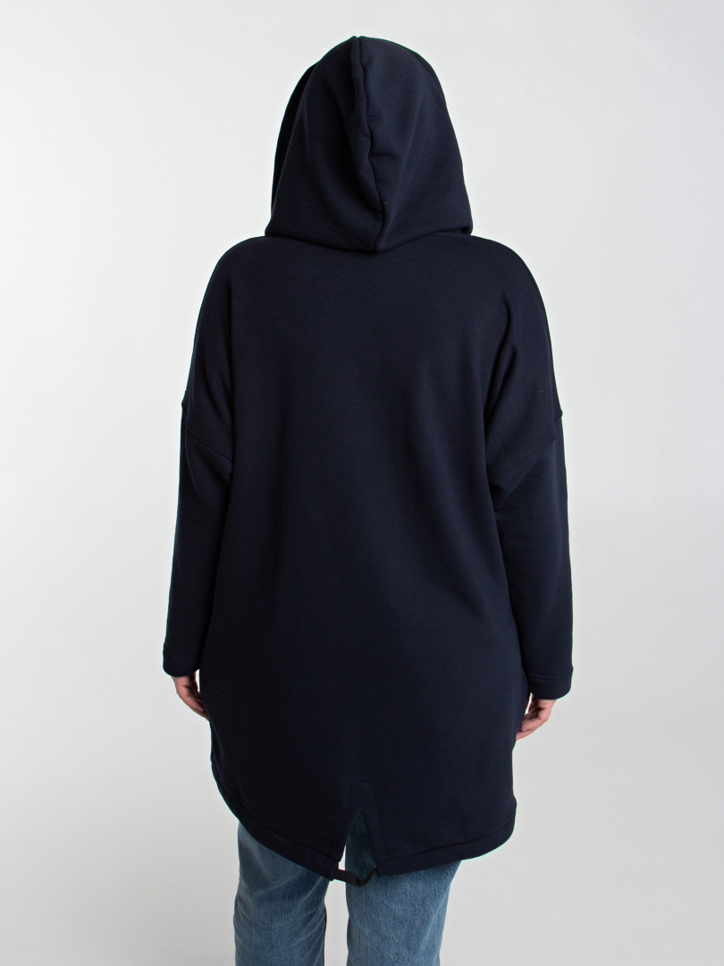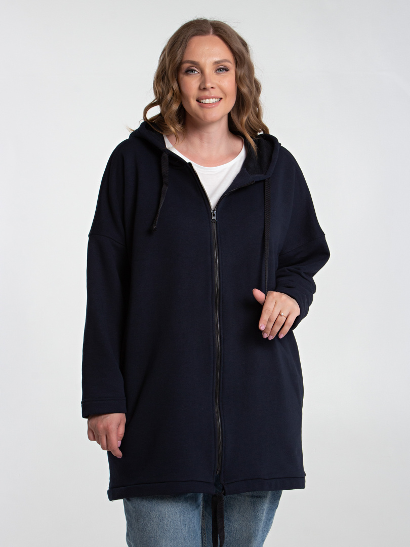 Удлинённый кардиган выполнен из плотного трикотажа. Модель имеет оригинальный свободный покрой со спущенным плечом и прямым рукавом.  В боковых швах – внутренние карманы. Застёжка – молния. По низу изделия – кулиска со шнуром и декоративный вырез по низу спинки.  Завершает образ модели – капюшон.