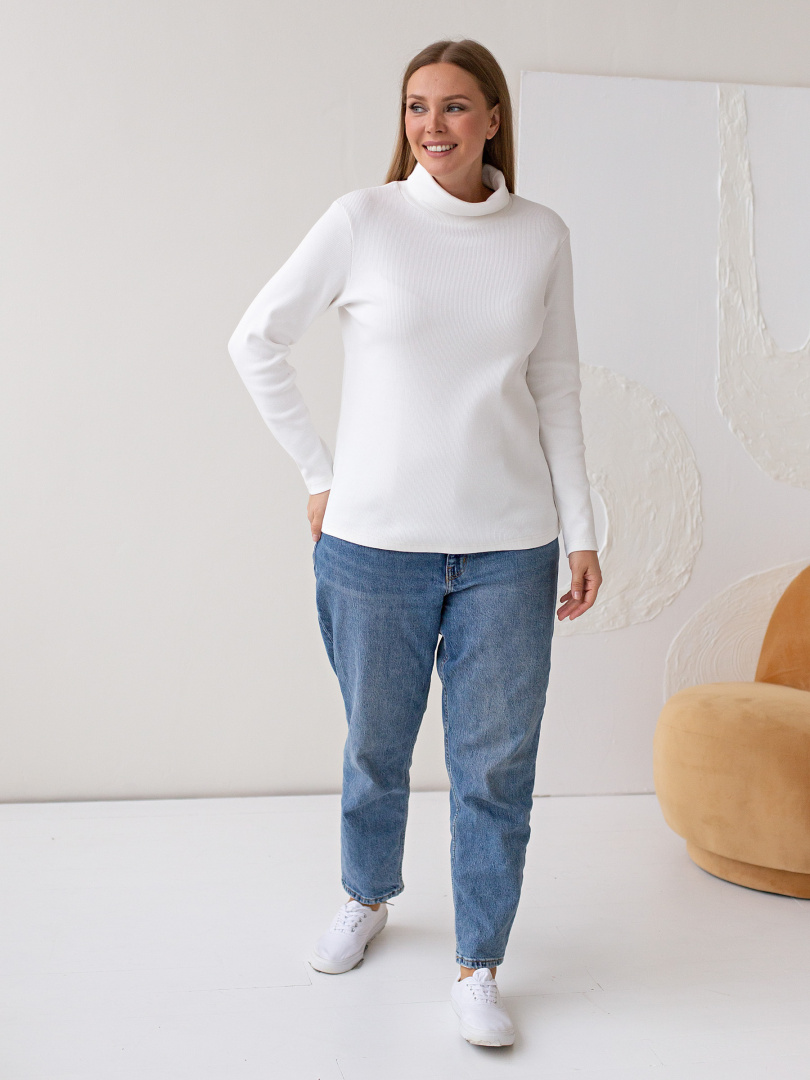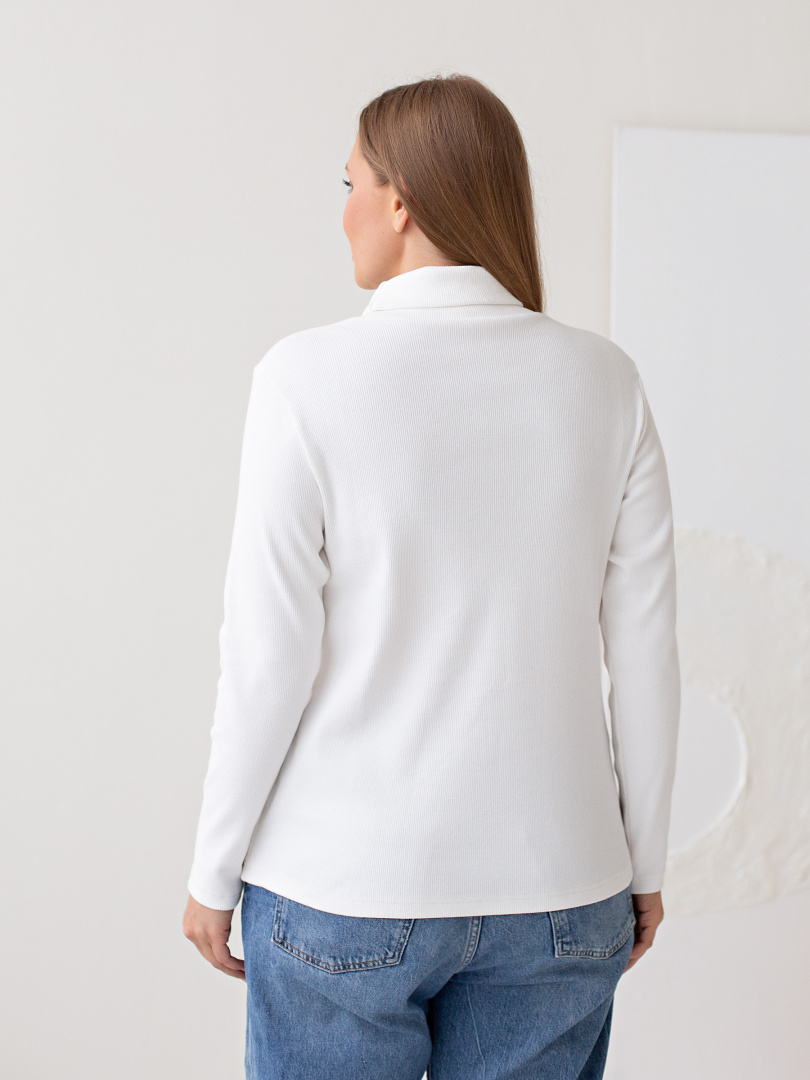 Джемпер прилегающего силуэта из эластичного трикотажа. Модель средней длины. Горловина имеет растяжимый воротник-стойку.
