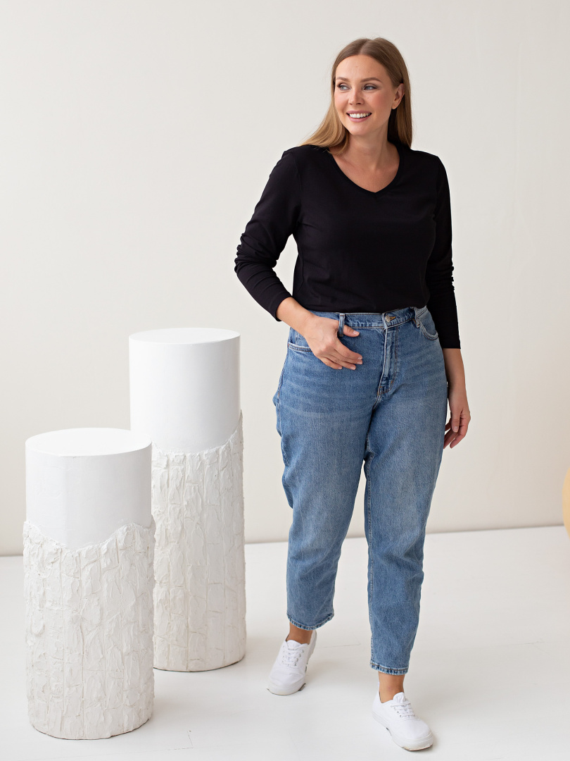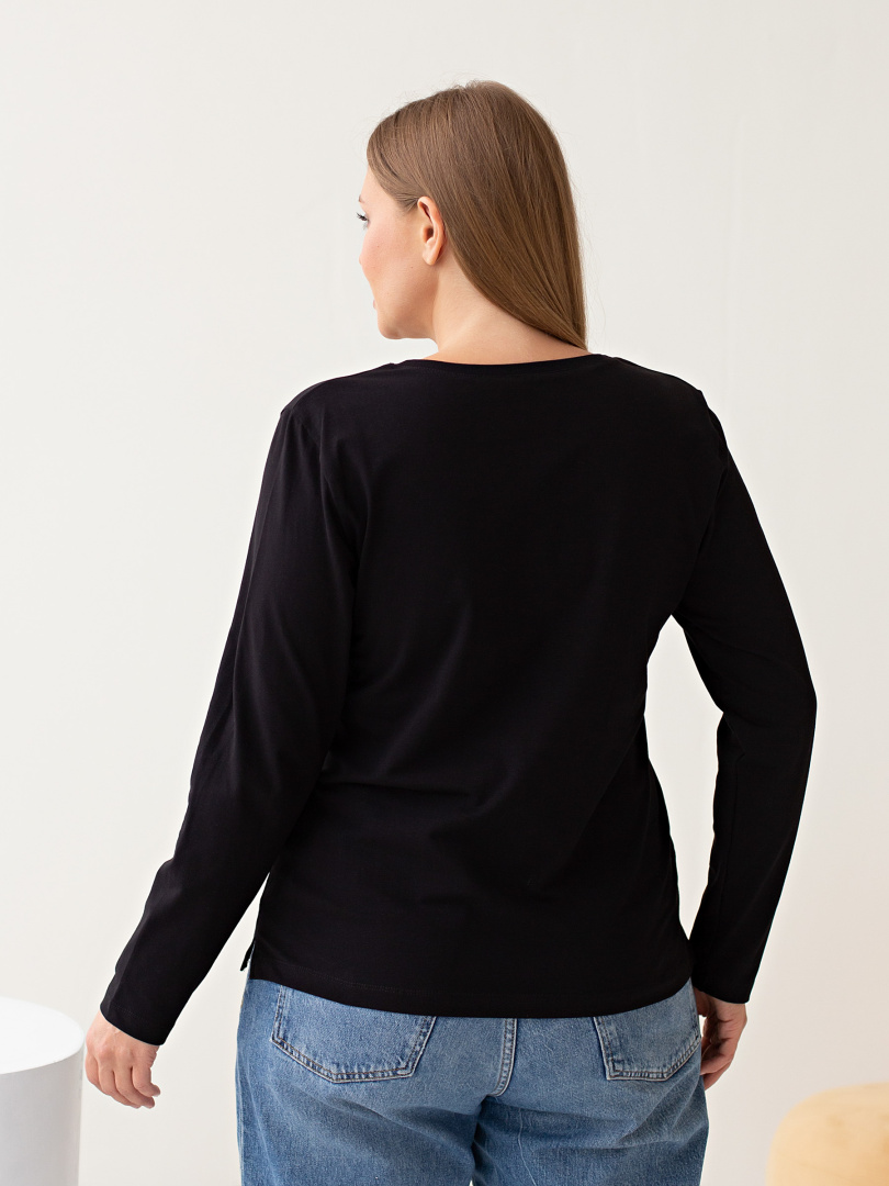 Блуза средней длины прилегающего силуэта из тонкого хлопка с лайкрой. Модель имеет длинный рукав и V-образный вырез горловины. Низ боковых швов оформлен разрезами.