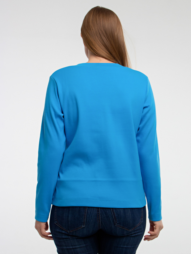 Джемпер прямого силуэта из эластичного трикотажа. Рукав длинный. V-образный вырез горловины обработан обтачкой, переходящей в планку с застежкой на пуговицы.