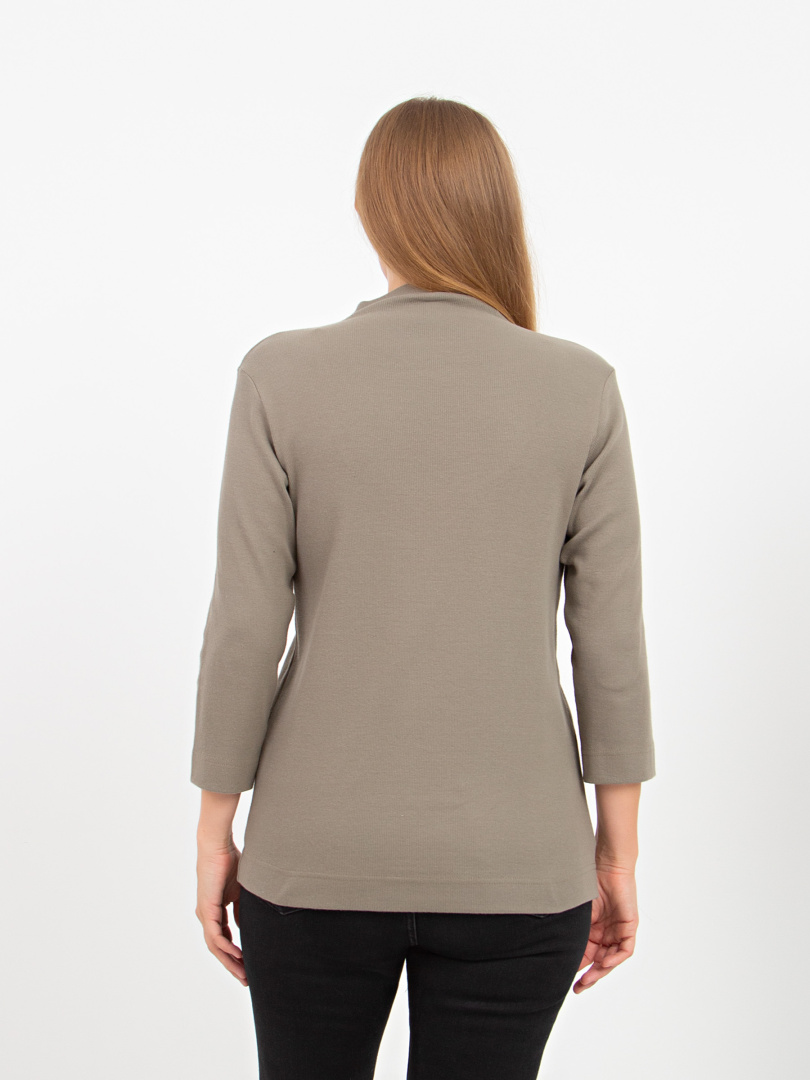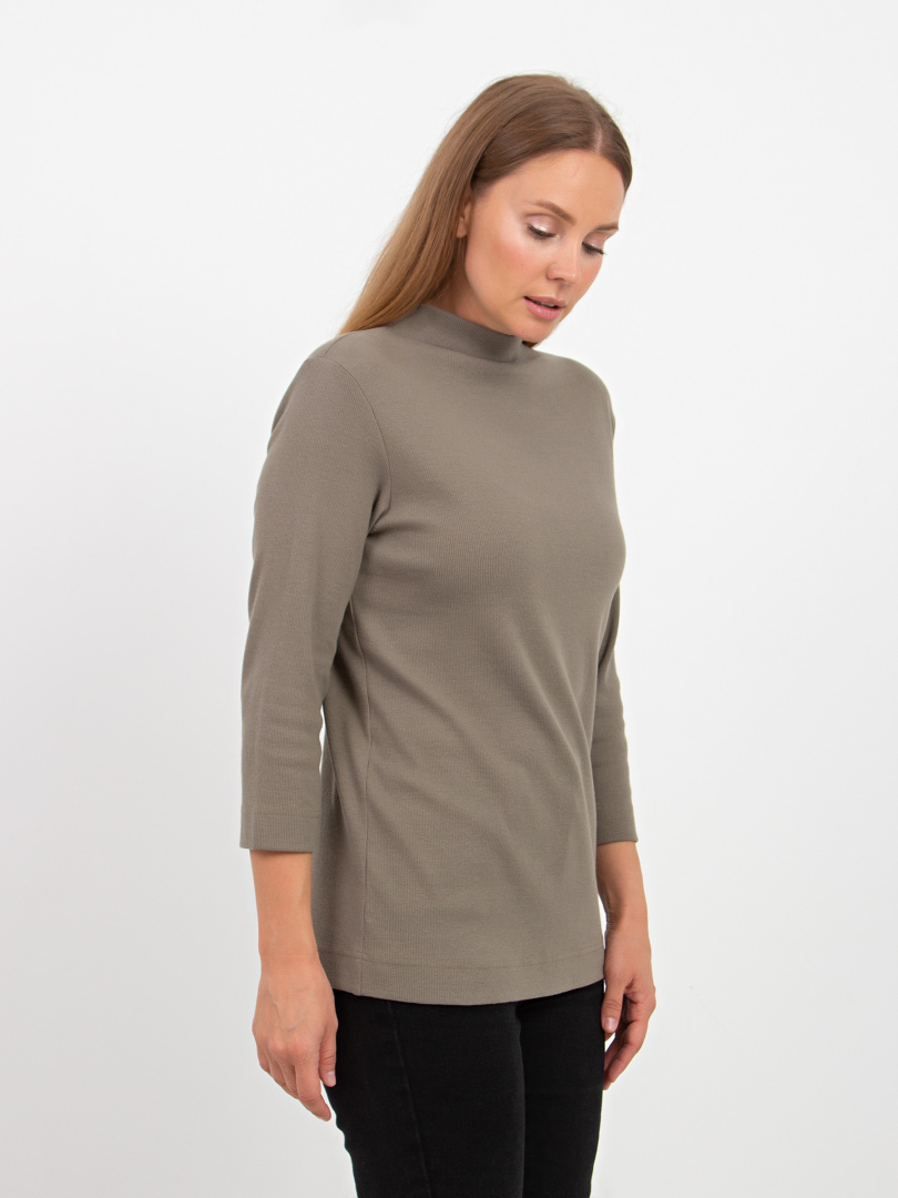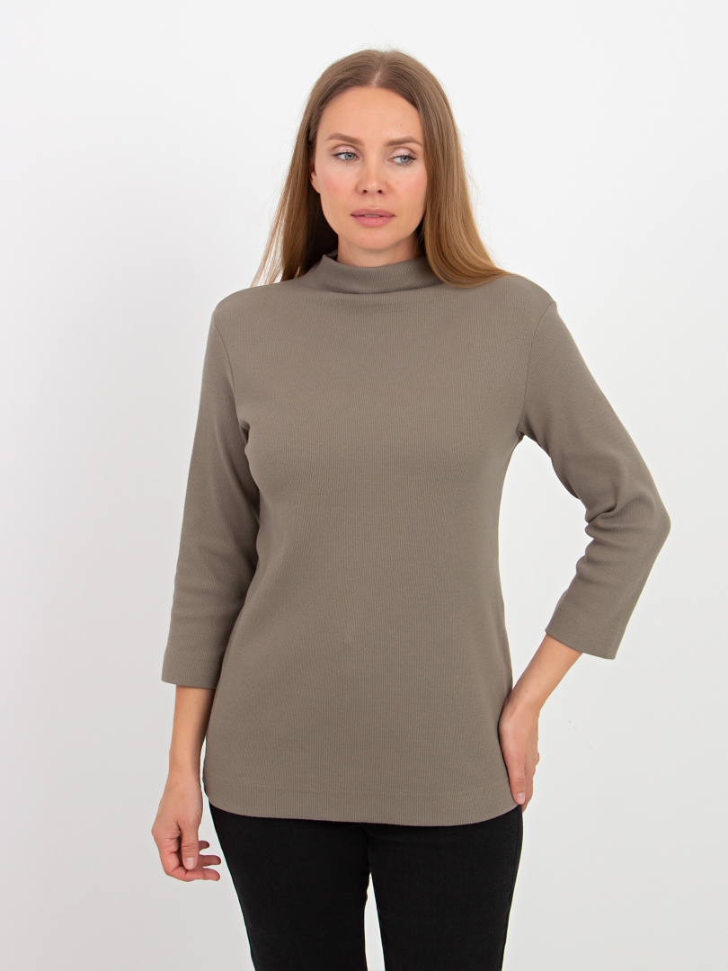 Джемпер средней длины, выполнен из мягкого эластичного трикотажа. Покрой прямой. Рукав втачной 3/4. Воротник – цельнокроеная стойка.