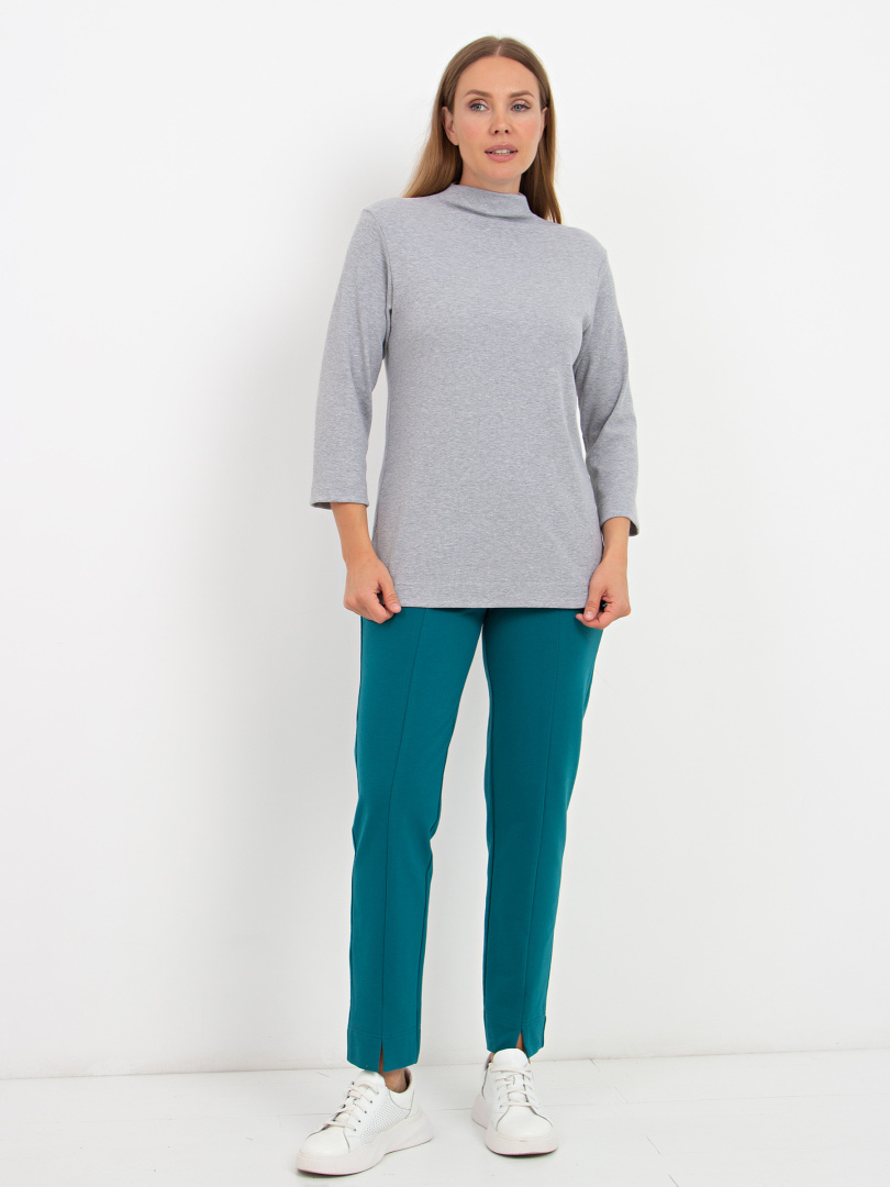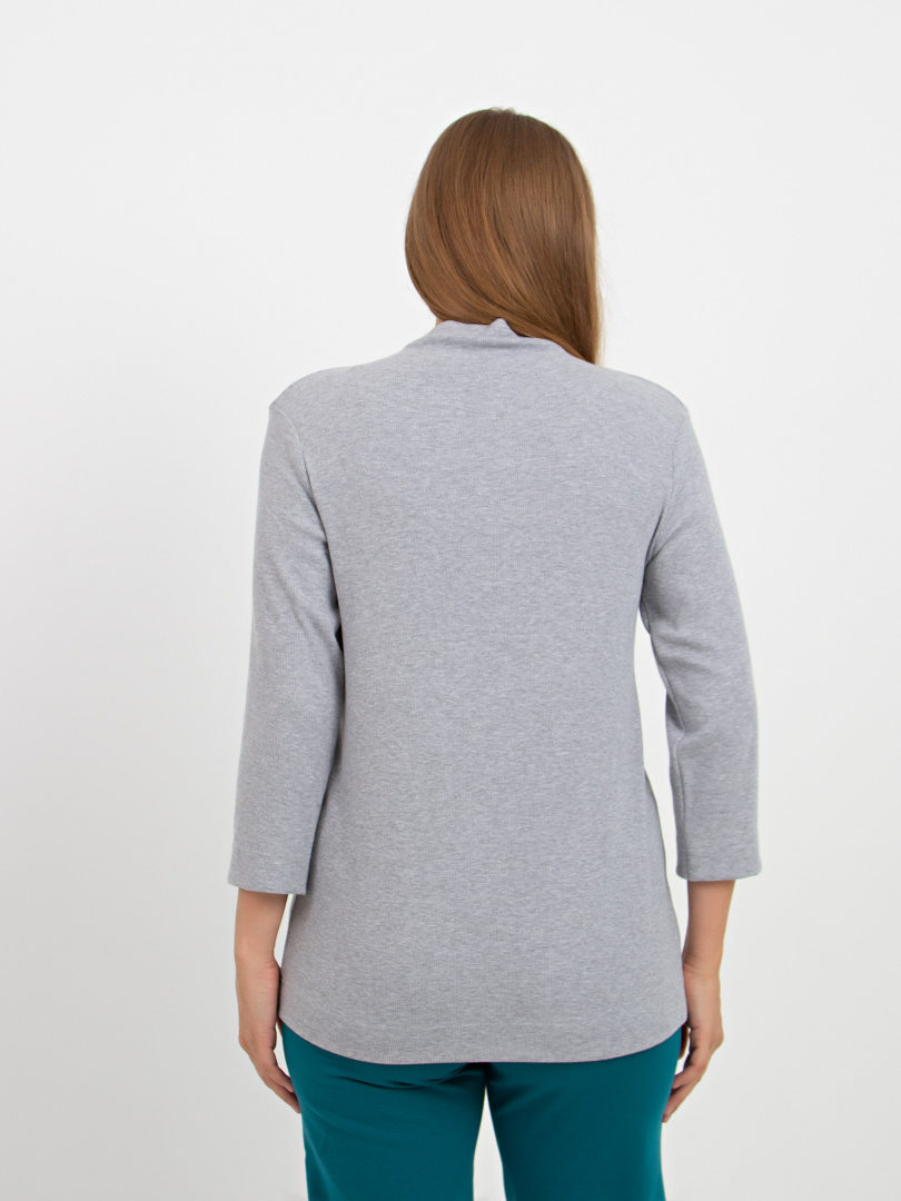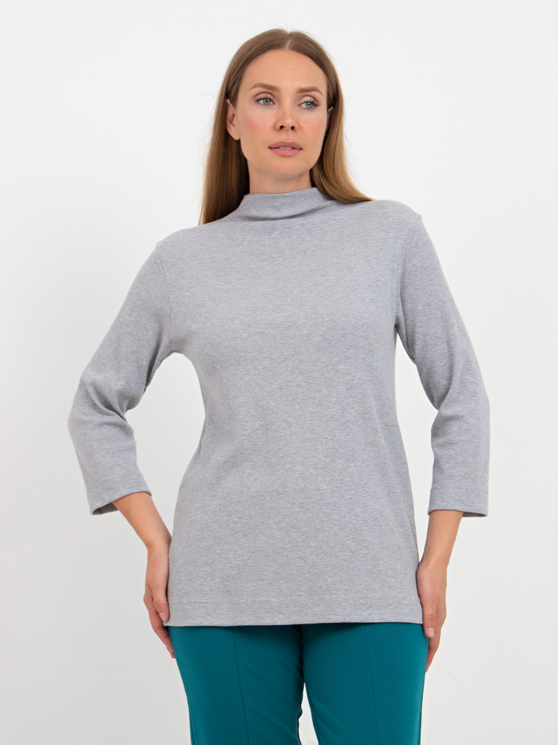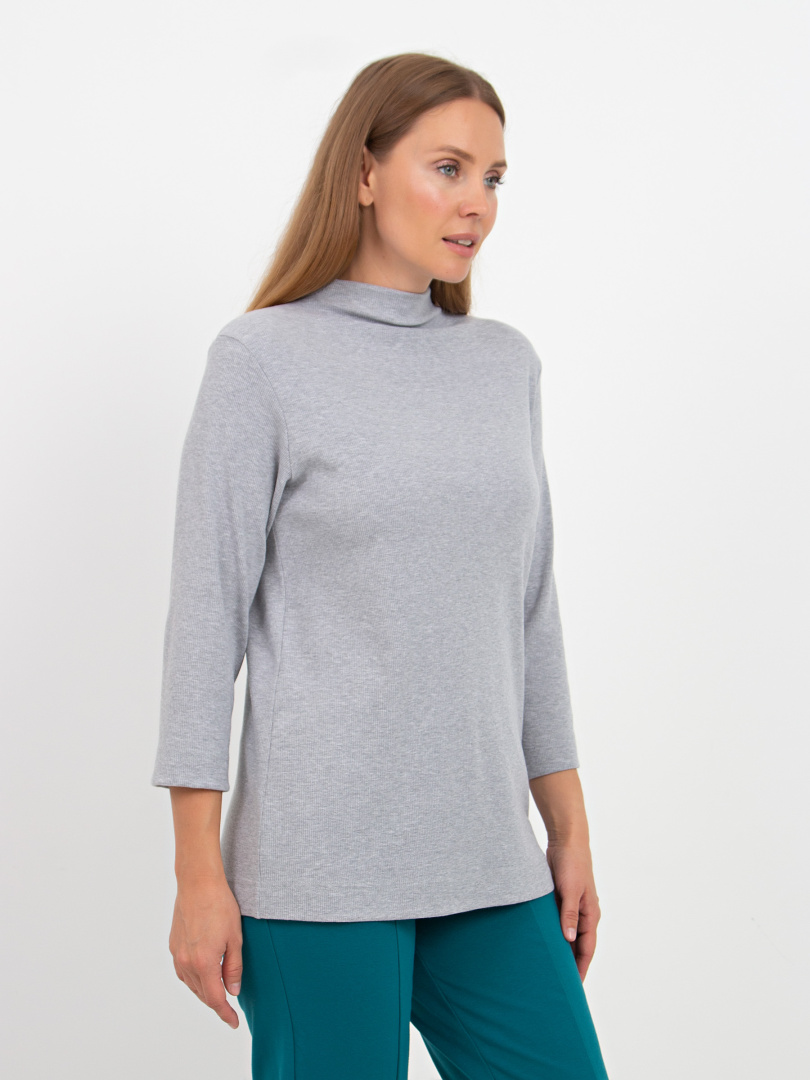Джемпер средней длины, выполнен из мягкого эластичного трикотажа. Покрой прямой. Рукав втачной 3/4. Воротник – цельнокроеная стойка.