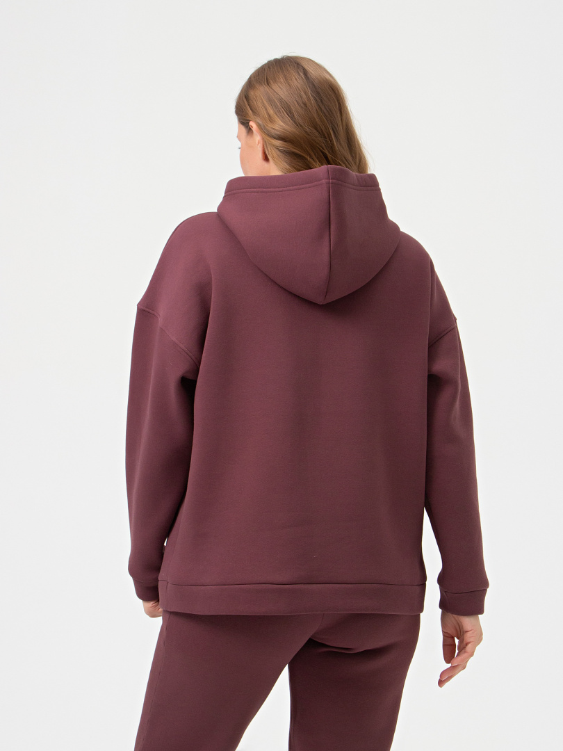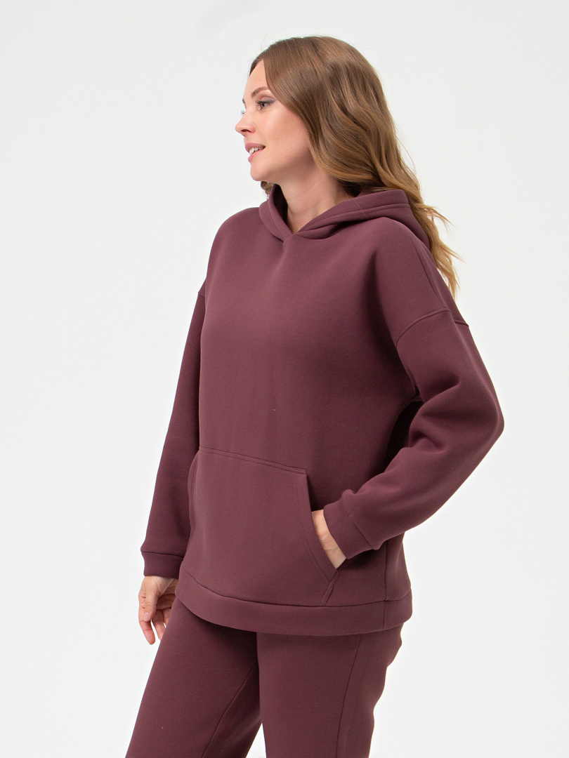 Джемпер средней длины с капюшоном, выполнен из плотного трикотажа с начесом. Покрой свободный, рукав со спущенным плечом. По переду - карман. Низ рукавов – манжеты. Низ джемпера – притачной пояс.