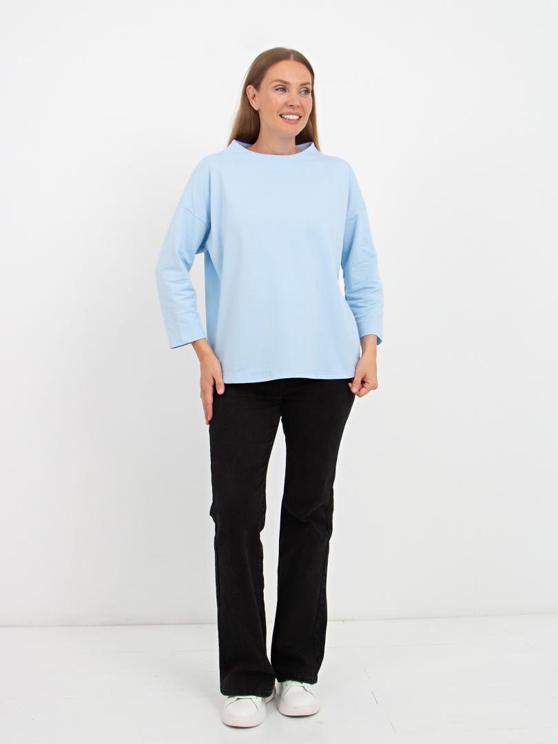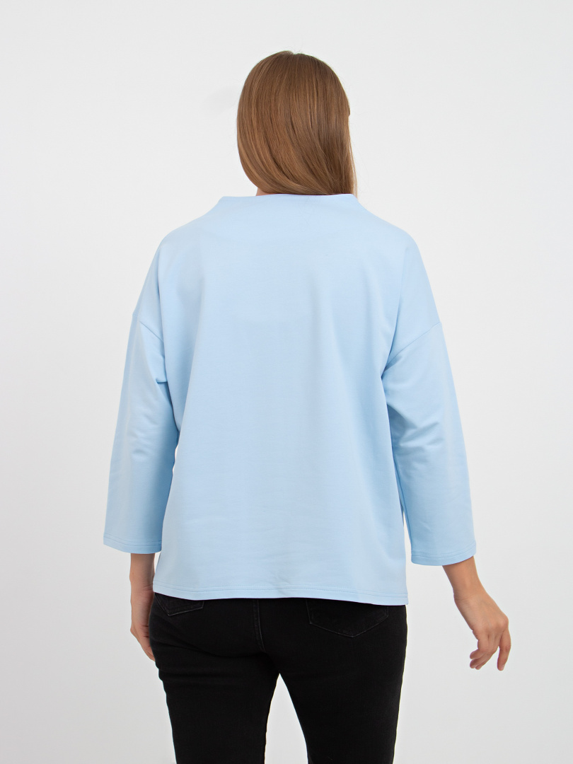Джемпер прямого силуэта с рукавом 3/4. Вырез горловины круглый, переходящий в небольшую стойку.