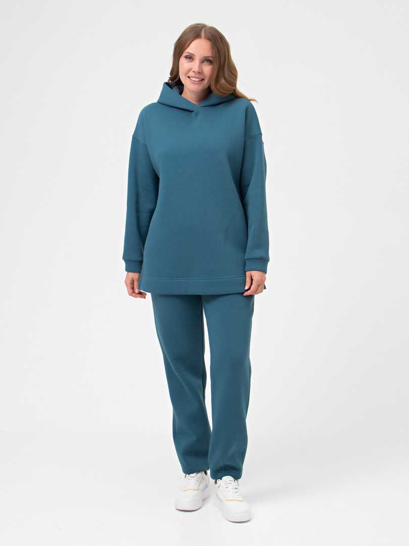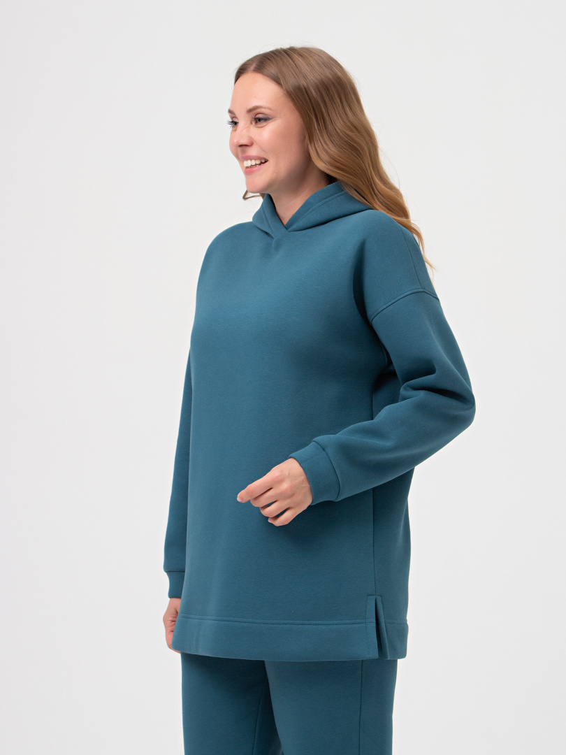 Джемпер средней длины с капюшоном, выполнен из плотного трикотажа с начёсом. Покрой свободный, рукав со спущенным плечом. Низ боковых швов – разрезы. Низ рукавов – манжеты.