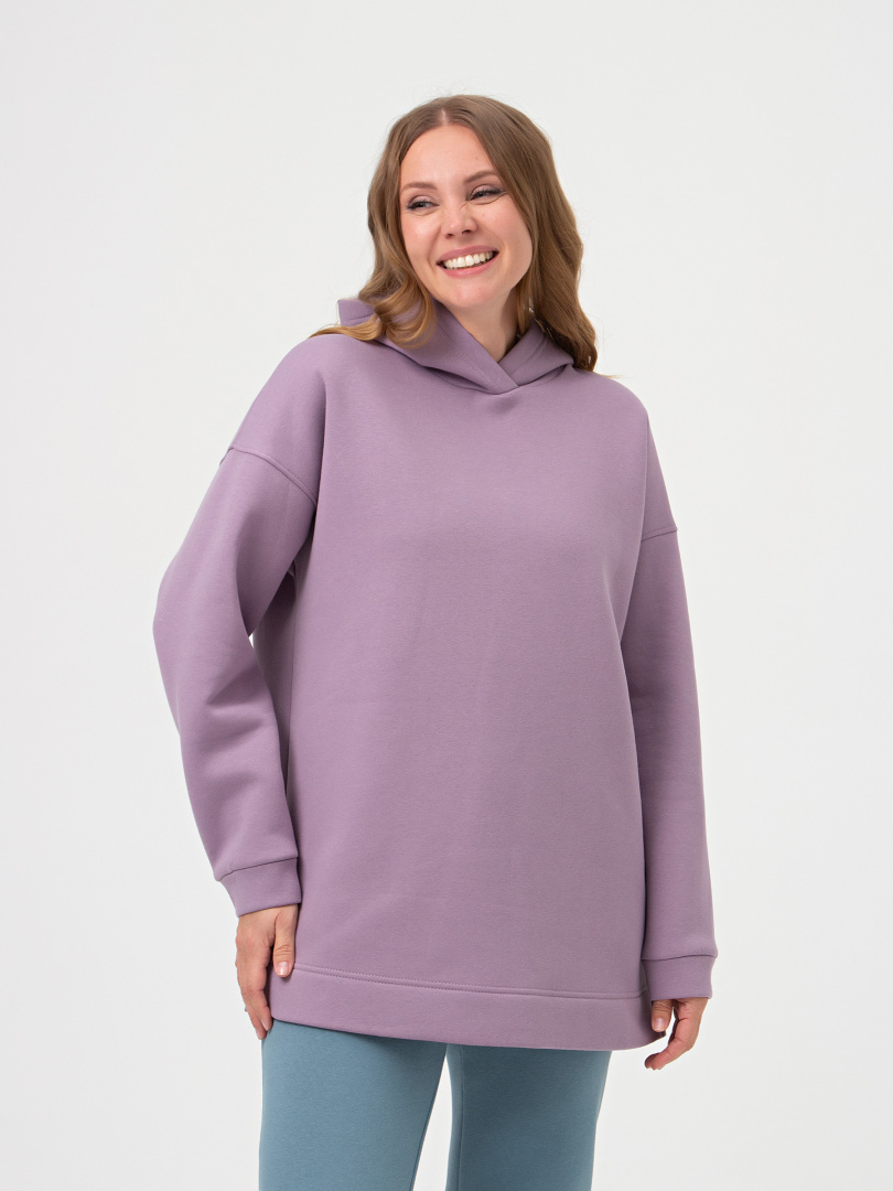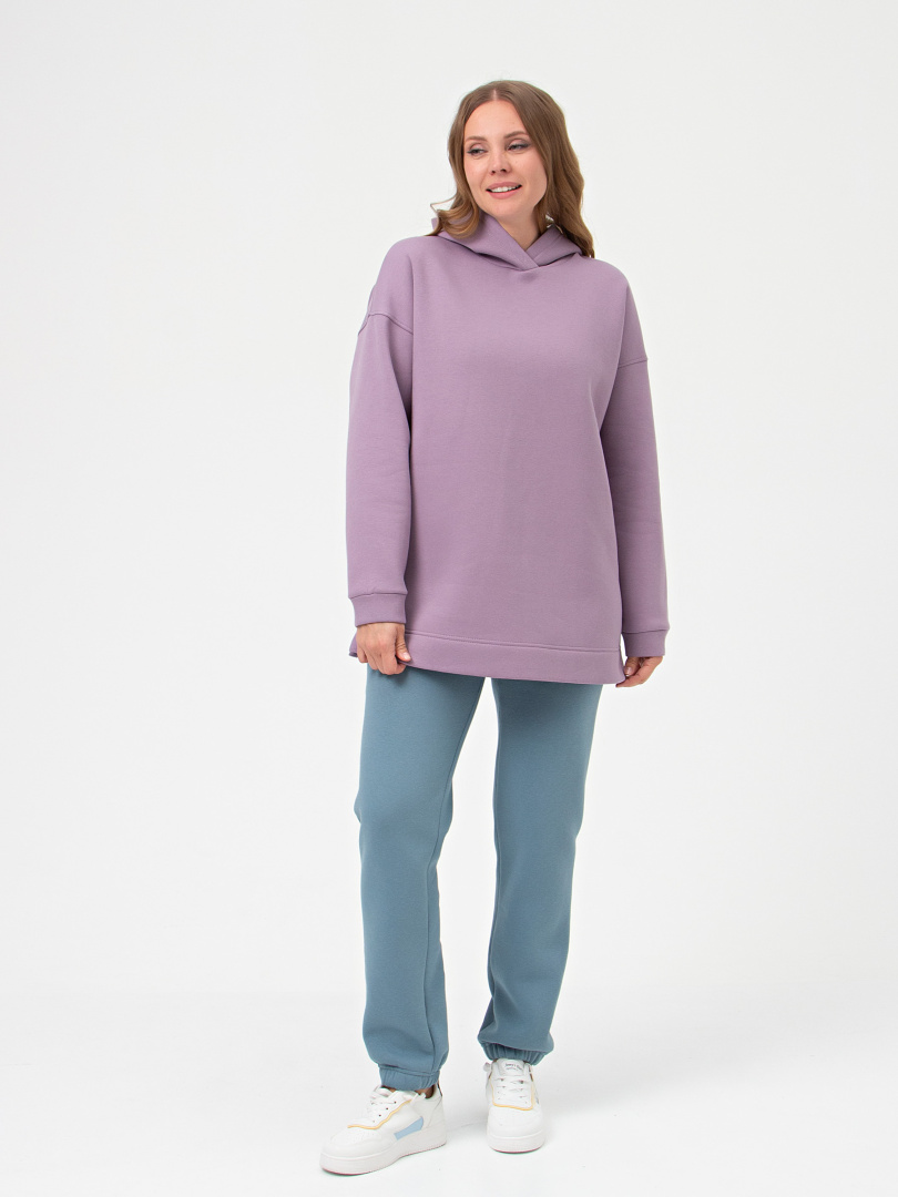 Джемпер средней длины с капюшоном, выполнен из плотного трикотажа с начёсом. Покрой свободный, рукав со спущенным плечом. Низ боковых швов – разрезы. Низ рукавов – манжеты.