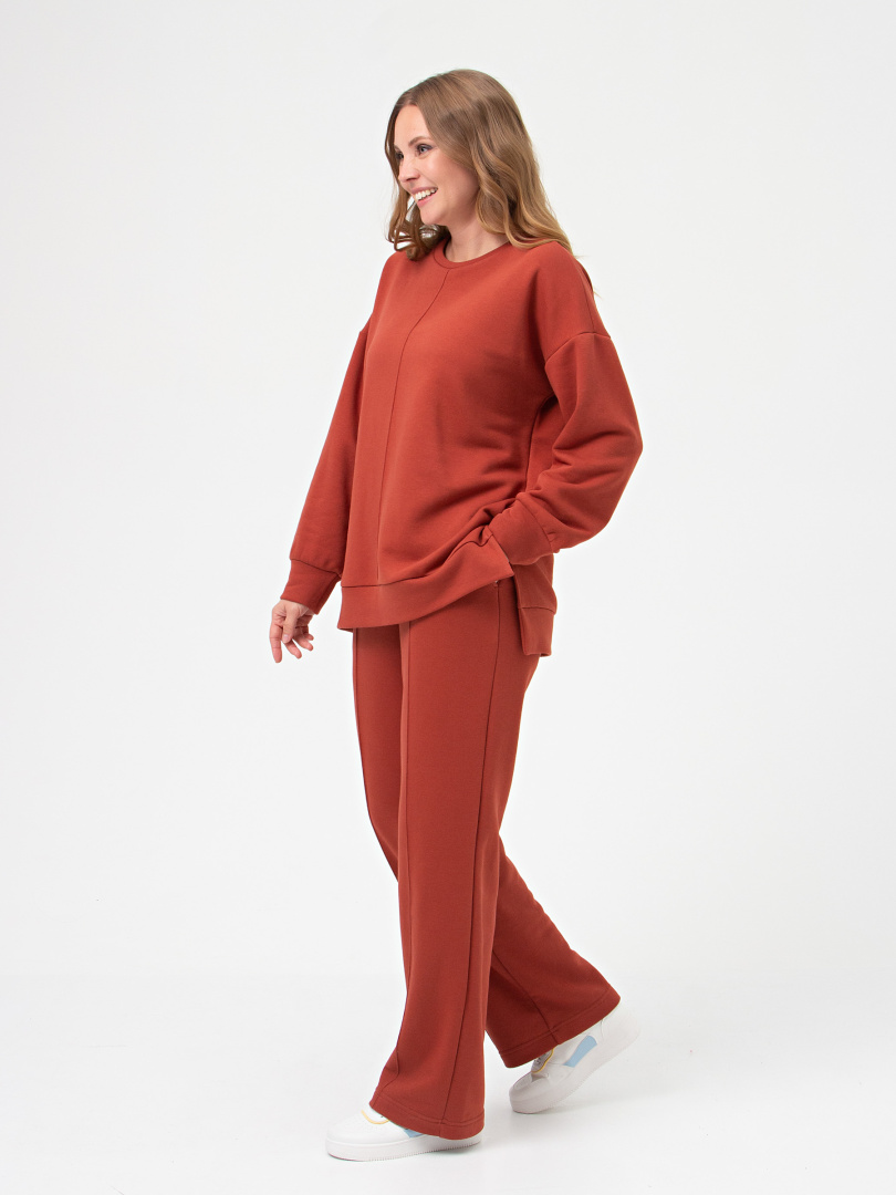 Джемпер удлиненный выполнен из плотного мягкого трикотажа. Покрой свободный, рукав со спущенным плечом. Низ рукавов собран на манжету. В боковых швах – разрезы. Низ джемпера – притачной пояс. Горловина круглая. Посередине переда узкая складка.