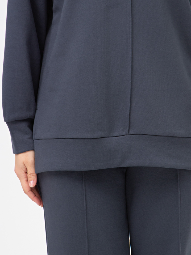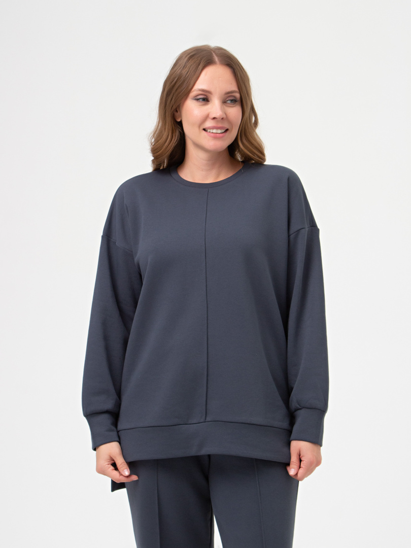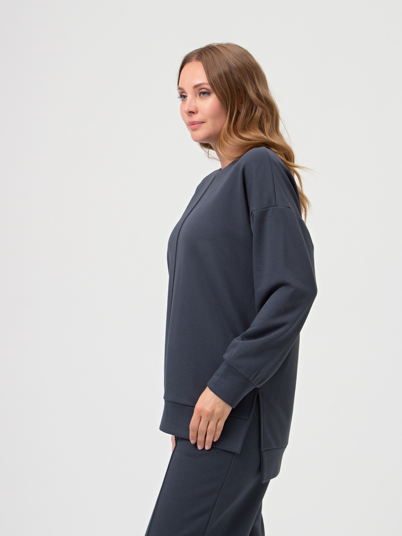 Джемпер удлиненный выполнен из плотного мягкого трикотажа. Покрой свободный, рукав со спущенным плечом. Низ рукавов собран на манжету. В боковых швах – разрезы. Низ джемпера – притачной пояс. Горловина круглая. Посередине переда узкая складка.