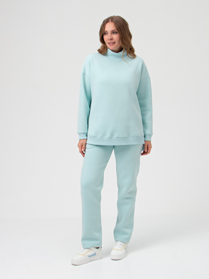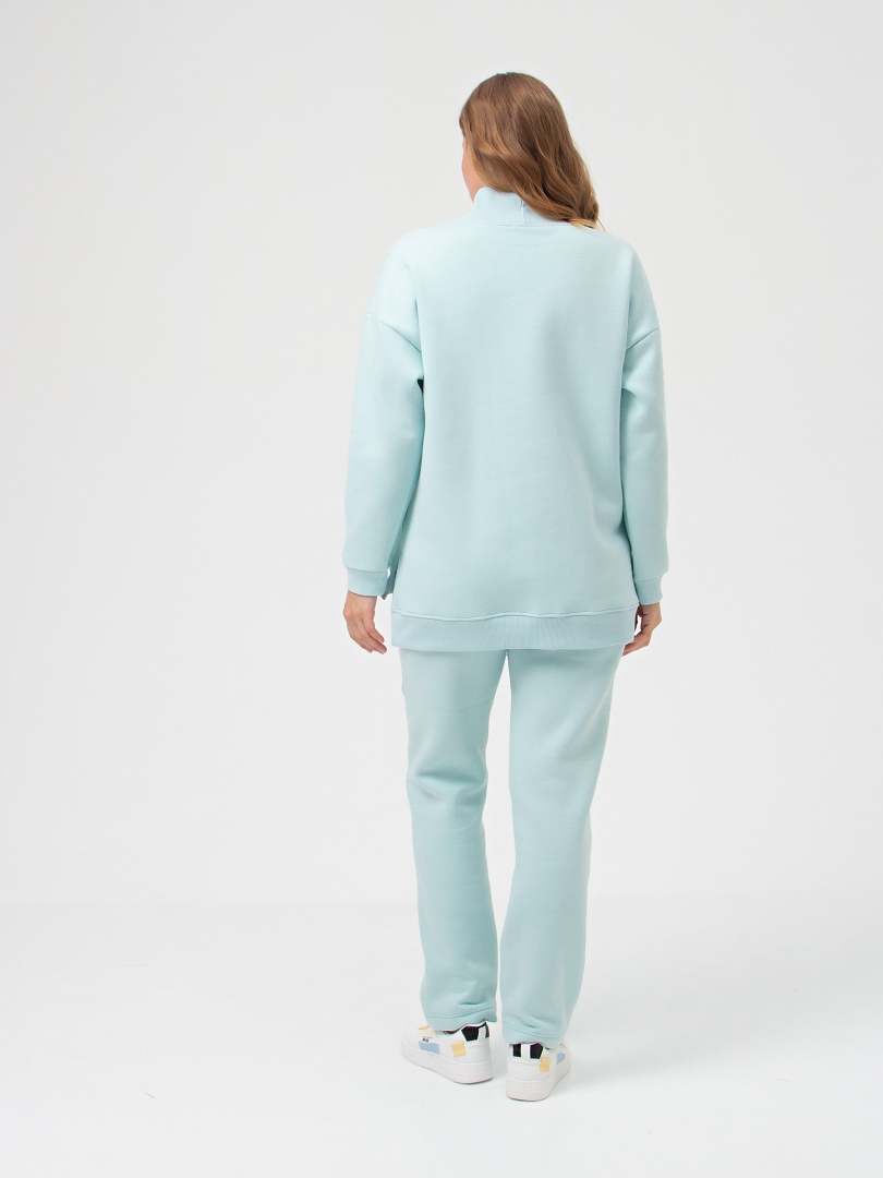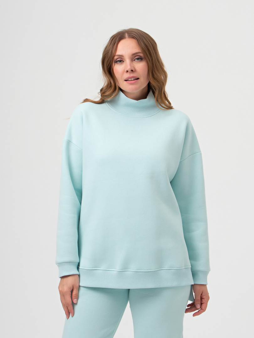 Джемпер средней длины выполнен из плотного трикотажа с начёсом. Покрой свободный, рукав со спущенным плечом. Воротник-стойка. Низ боковых швов – разрезы. По низу изделия - пояс. Низ рукавов – манжеты.