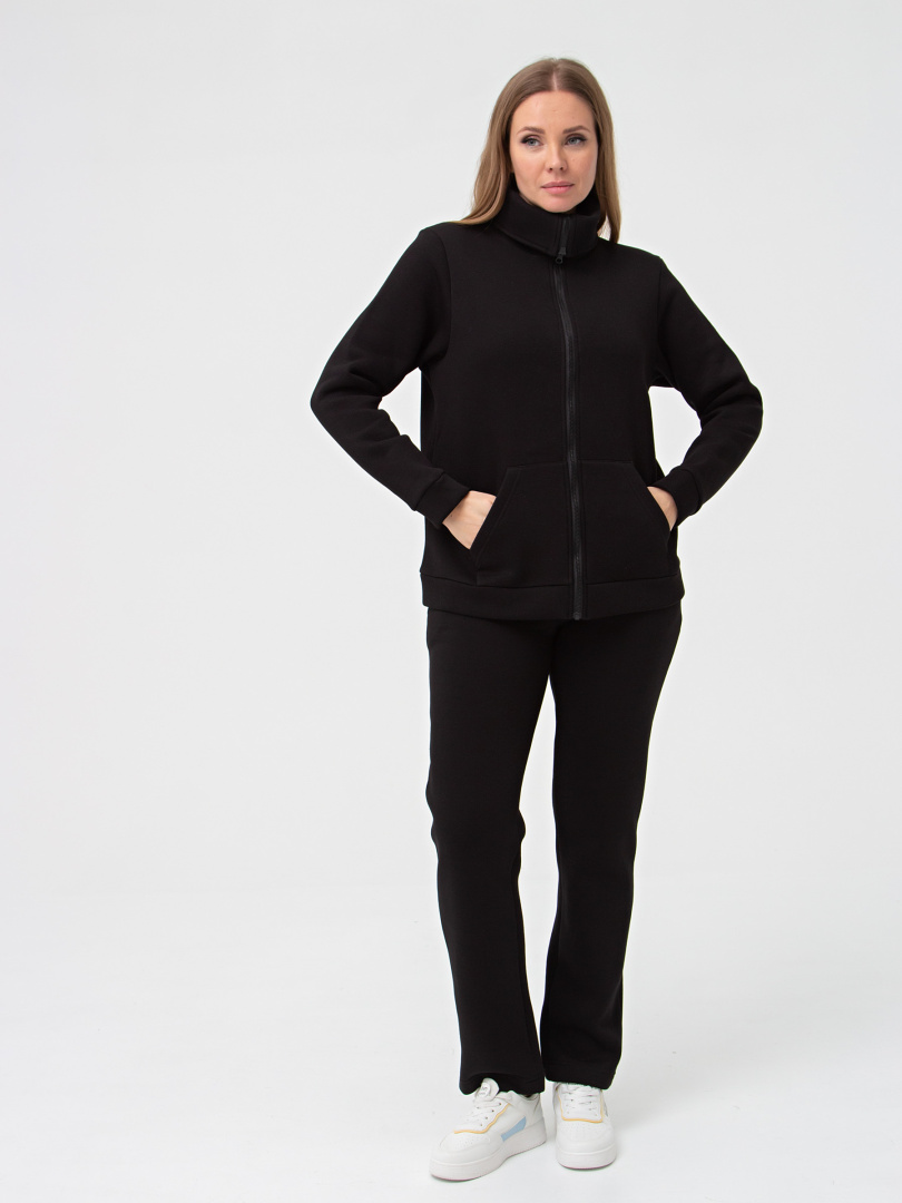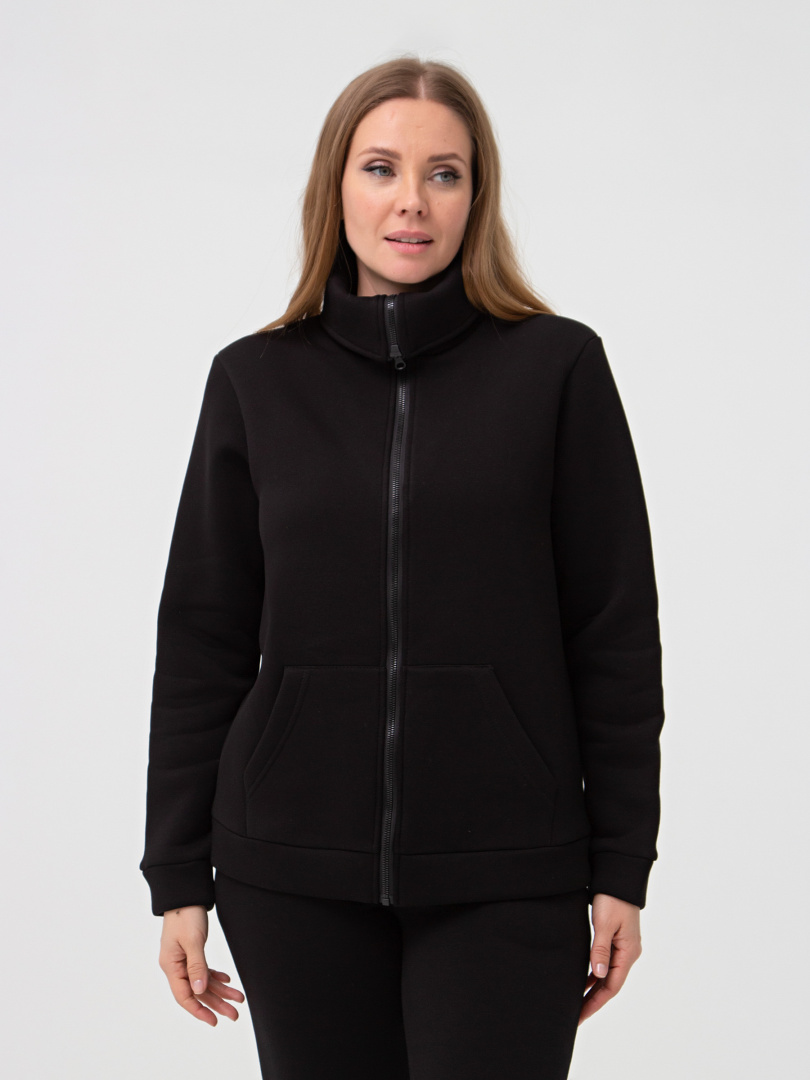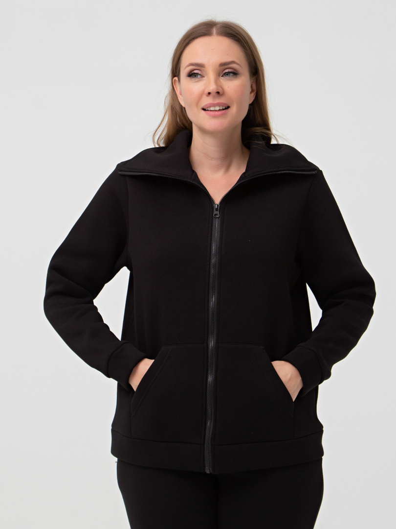 Джемпер средней длины выполнен из плотного футера с начёсом с застежкой на молнию. Покрой прямой, рукав втачной. Воротник – высокая стойка с отворотом. На переде – накладные карманы. По низу изделия - пояс. Низ рукавов – манжеты.