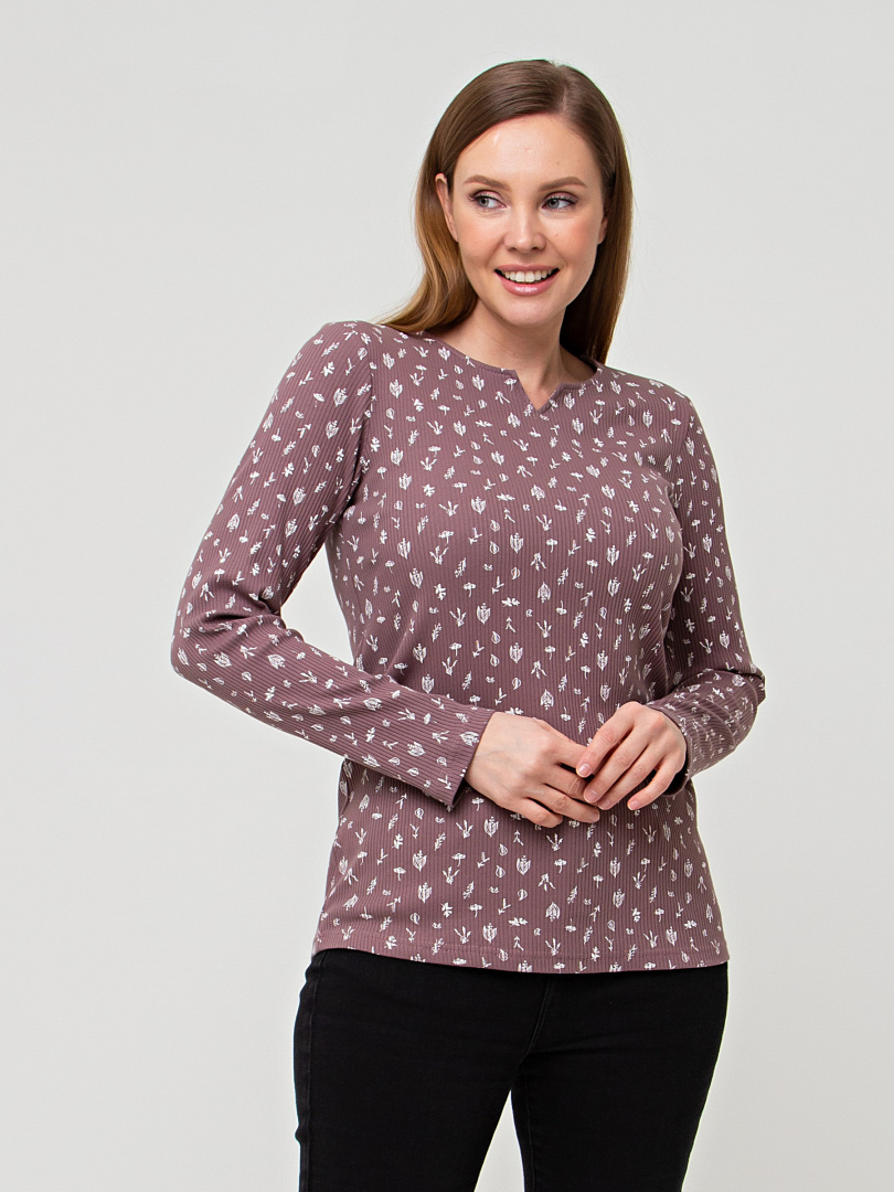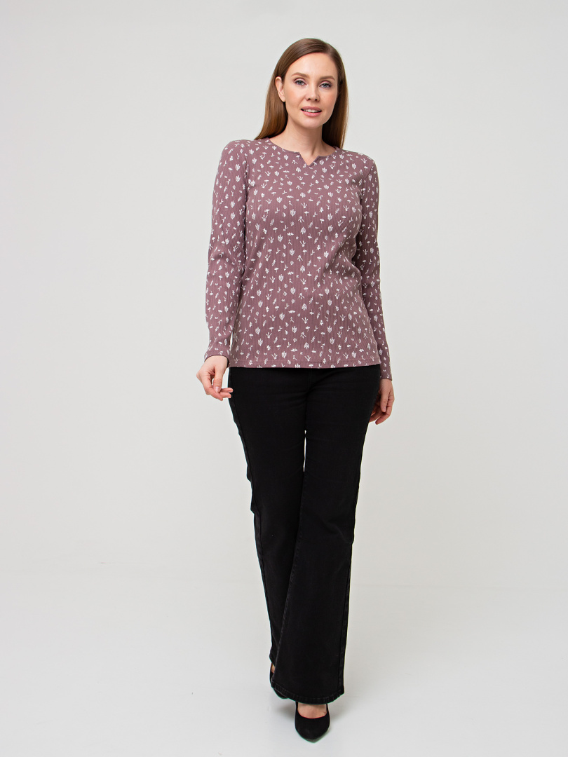 Джемпер прилегающего силуэта из эластичного трикотажа в рубчик. Модель средней длины. Горловина круглая с фигурным вырезом.