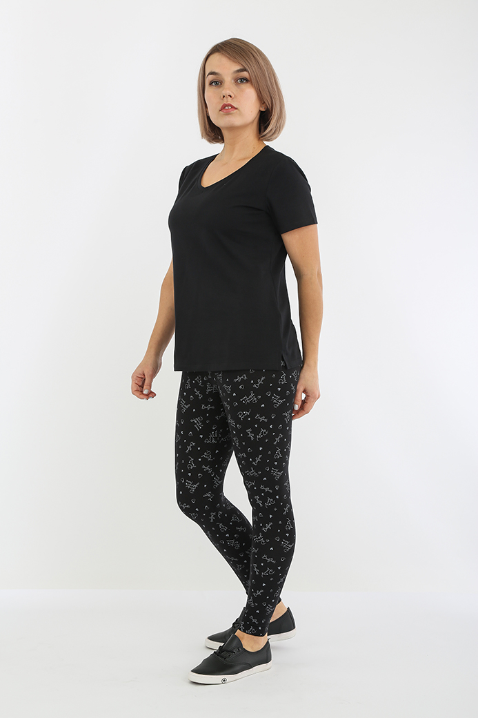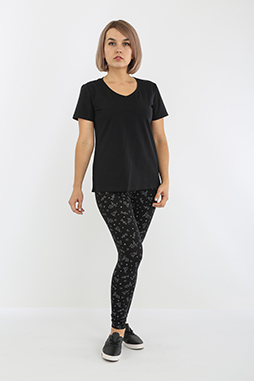 Футболка средней длины прилегающего силуэта из тонкого хлопка с лайкрой. Модель имеет короткий втачной рукав и V-образный вырез горловины.