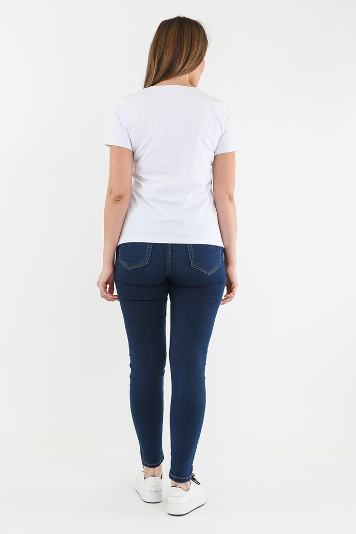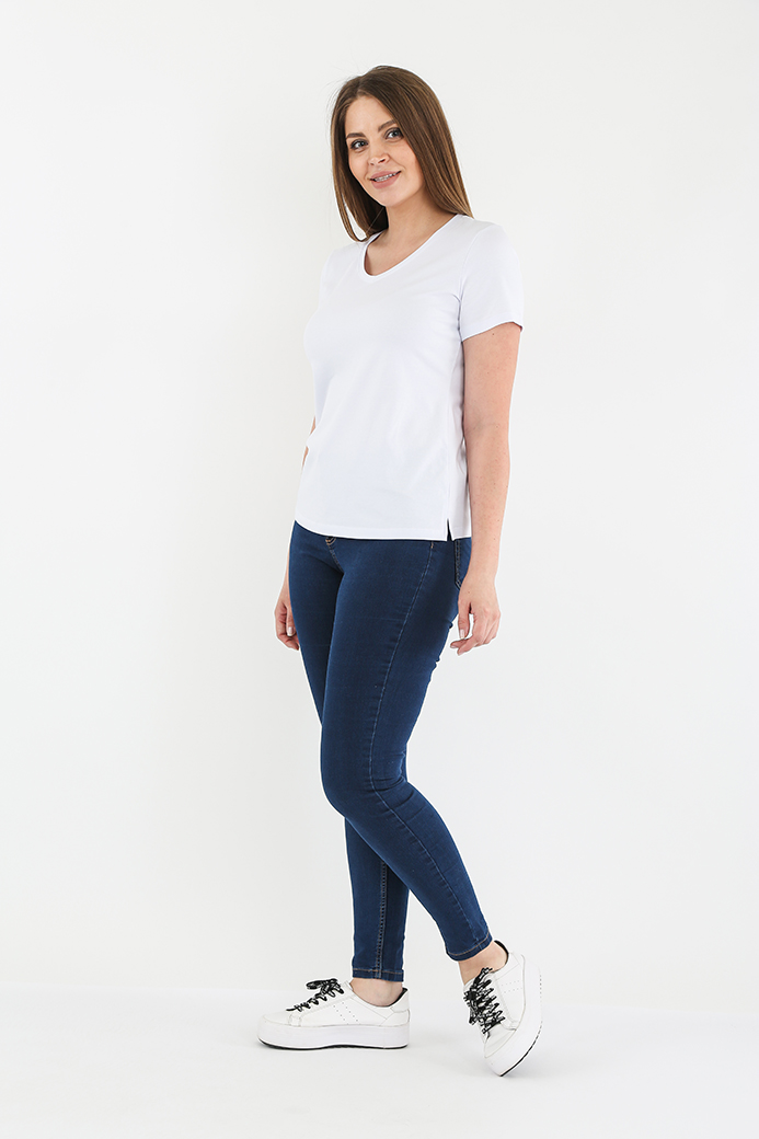 Футболка средней длины прилегающего силуэта из тонкого хлопка с лайкрой. Модель имеет короткий втачной рукав и V-образный вырез горловины.