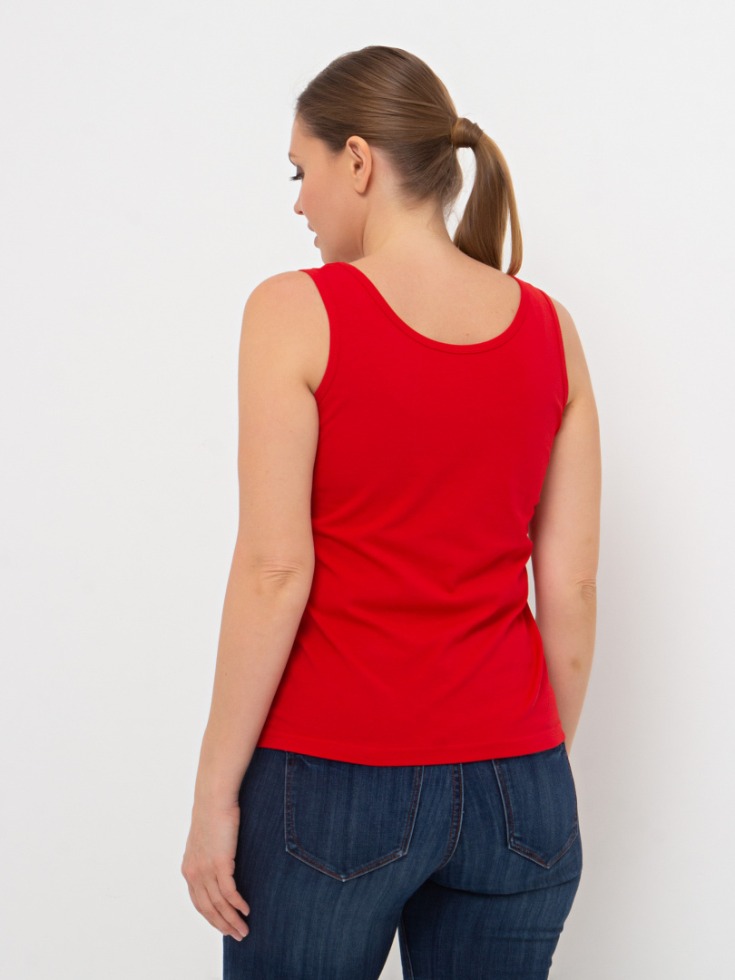 Майка из тонкого хлопка с лайкрой. Модель приталенного покроя. По пройме и горловине окантовка из того же материала. В левый боковой шов вшит «флажок» из отделочной ткани.