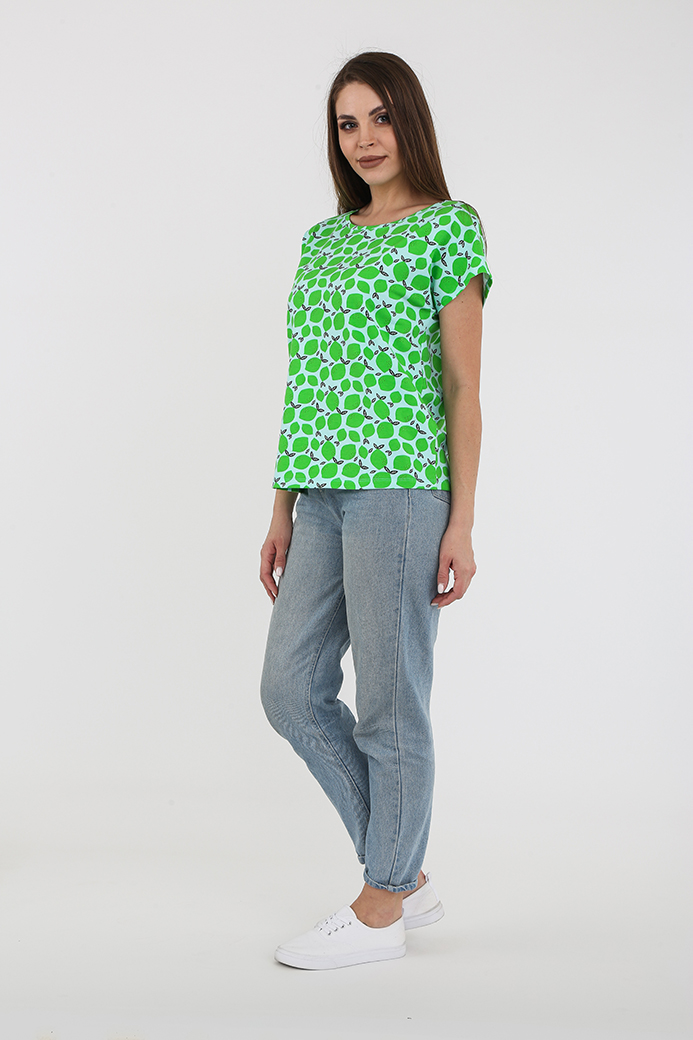 Футболка средней длины из трикотажа. Покрой свободный. Рукав кимоно. Вырез горловины круглый.