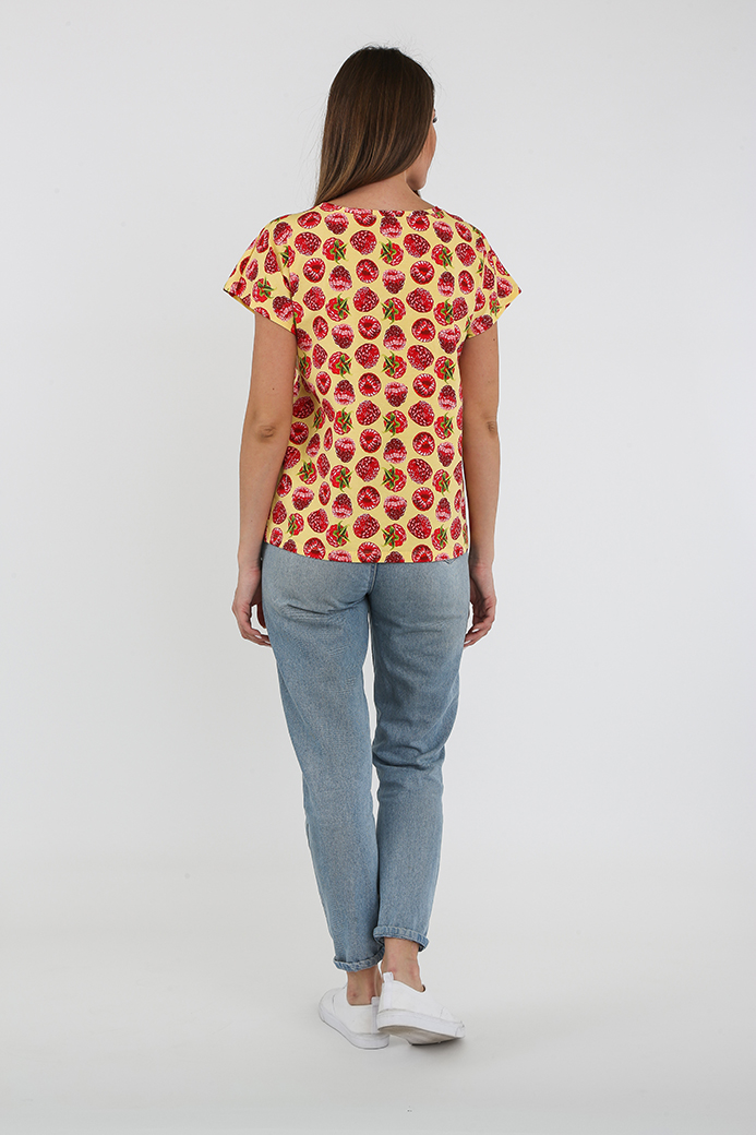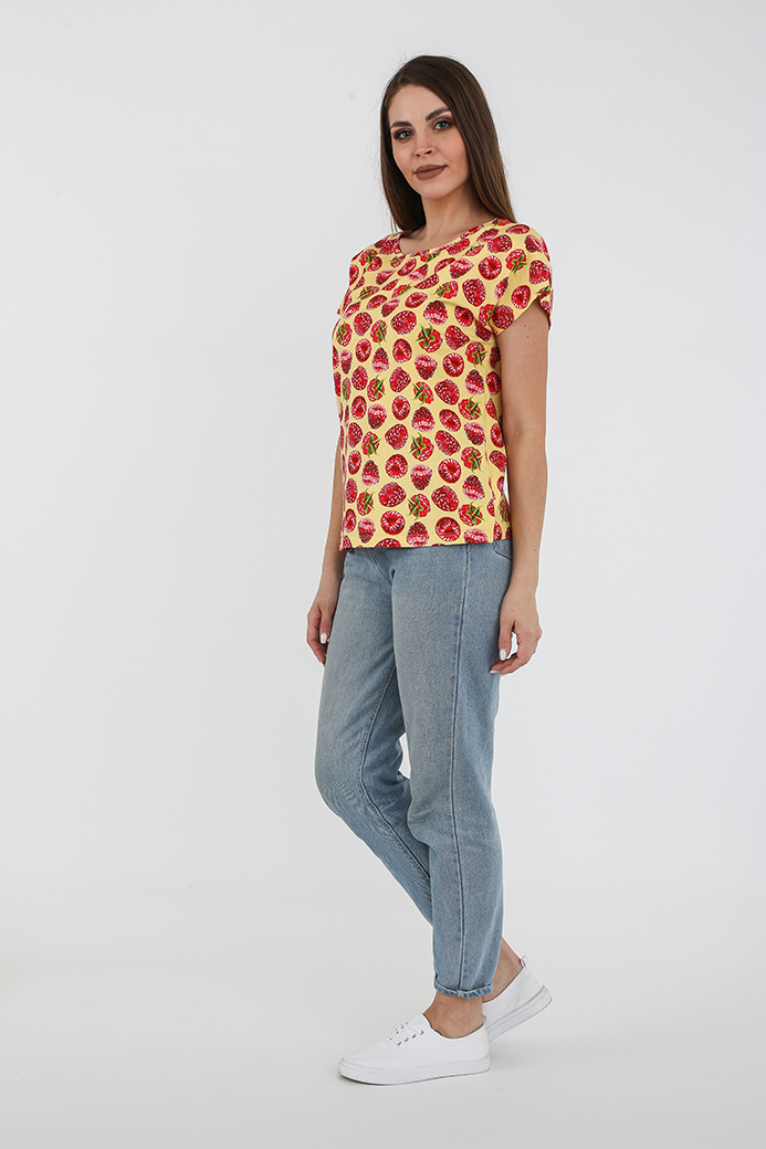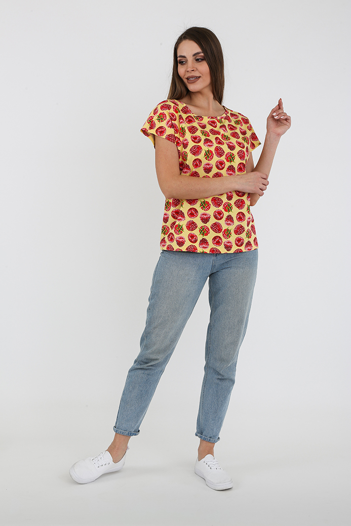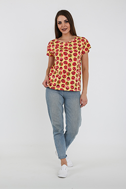 Футболка средней длины из трикотажа. Покрой свободный. Рукав кимоно. Вырез горловины круглый.