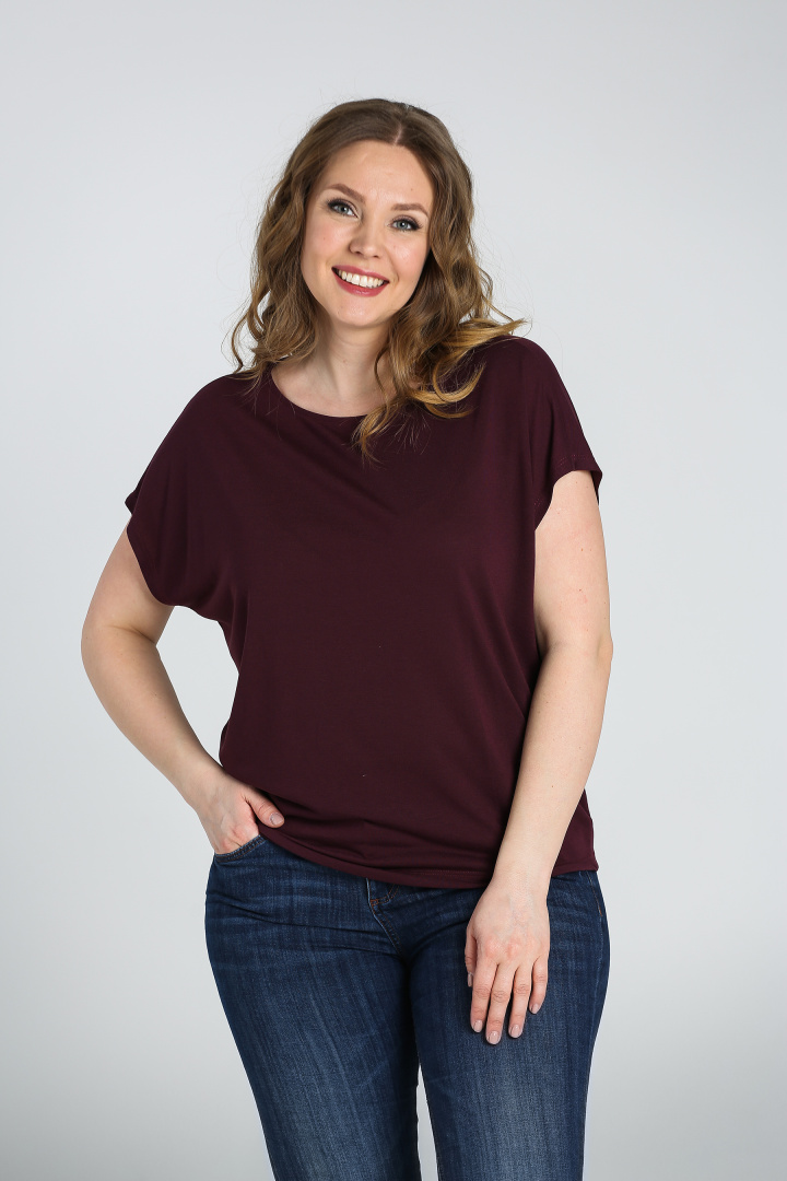 Блуза средней длины, выполнена из вискозы. Покрой свободный, со спущенным цельнокроеным рукавом. Вырез круглый.