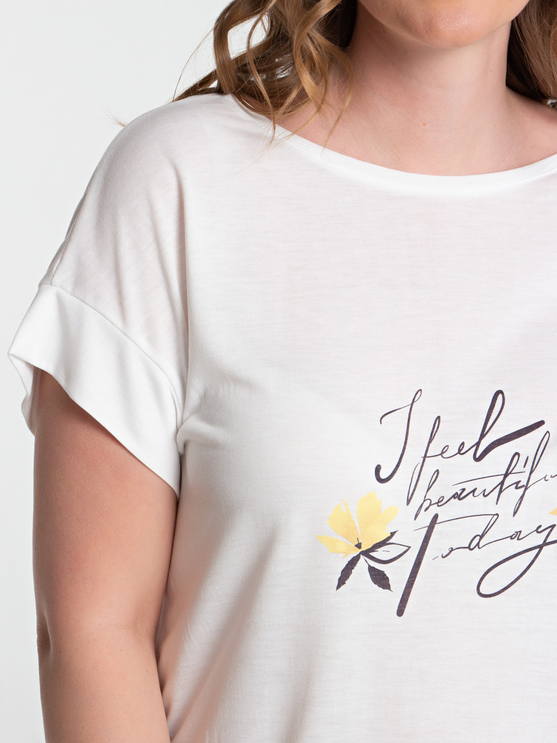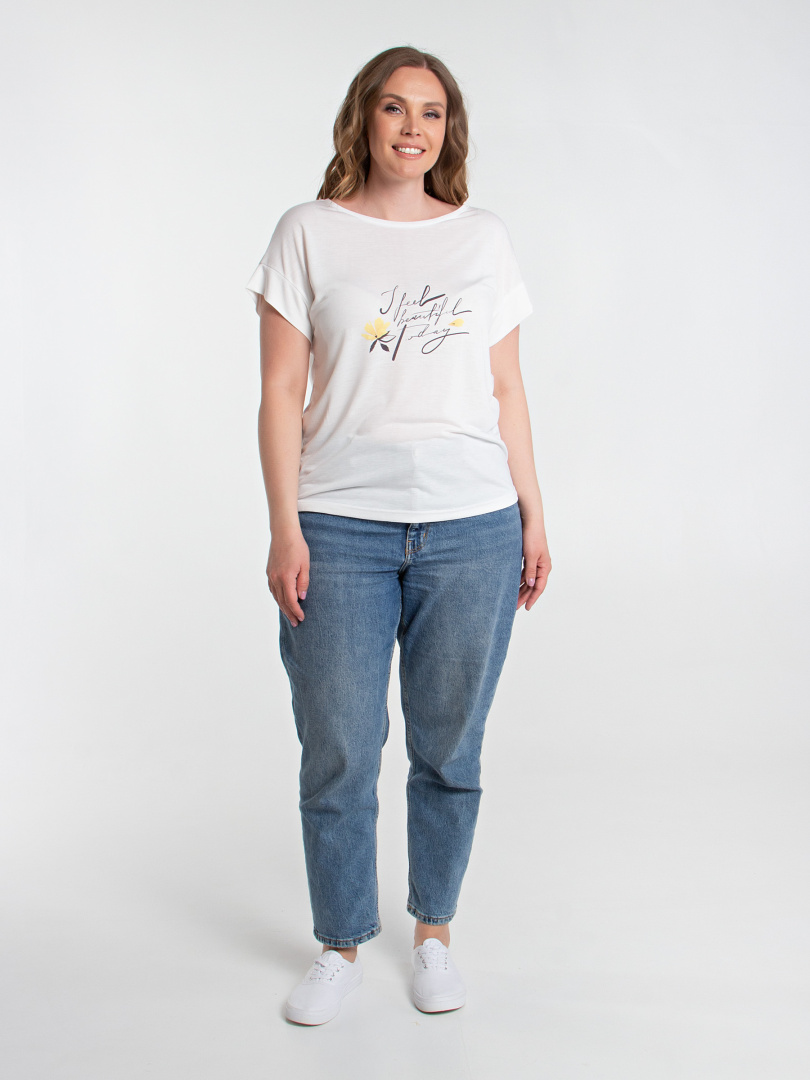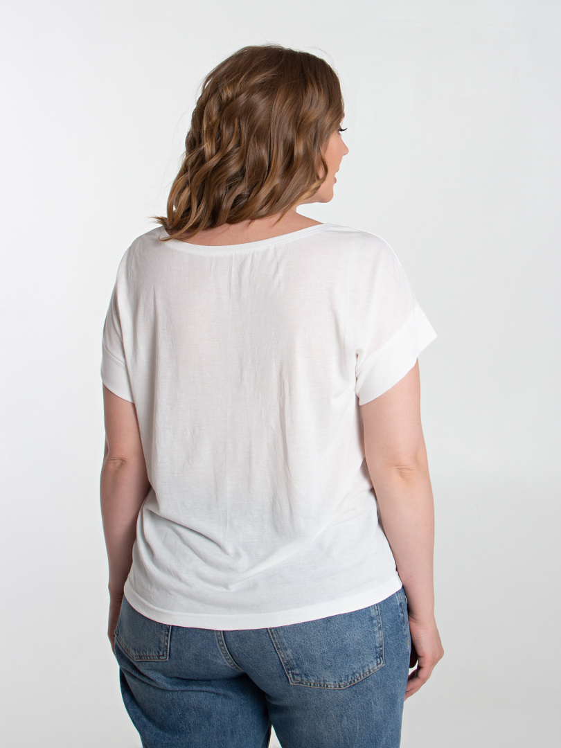 Блуза средней длины из трикотажа. Перед декорирован контрастным принтом. Покрой свободный, со спущенным рукавом. Вырез круглый.