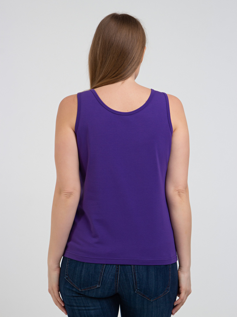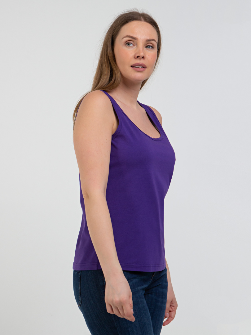 Майка из тонкого хлопка с лайкрой. Модель приталенного покроя. По пройме и горловине окантовка из того же материала. В левый боковой шов вшит «флажок» из отделочной ткани.