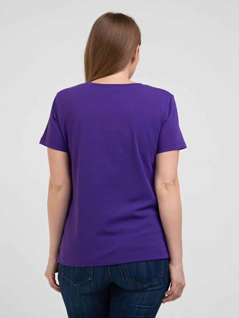 Футболка средней длины прилегающего силуэта из тонкого хлопка с лайкрой. Модель имеет короткий втачной рукав и V-образный вырез горловины.