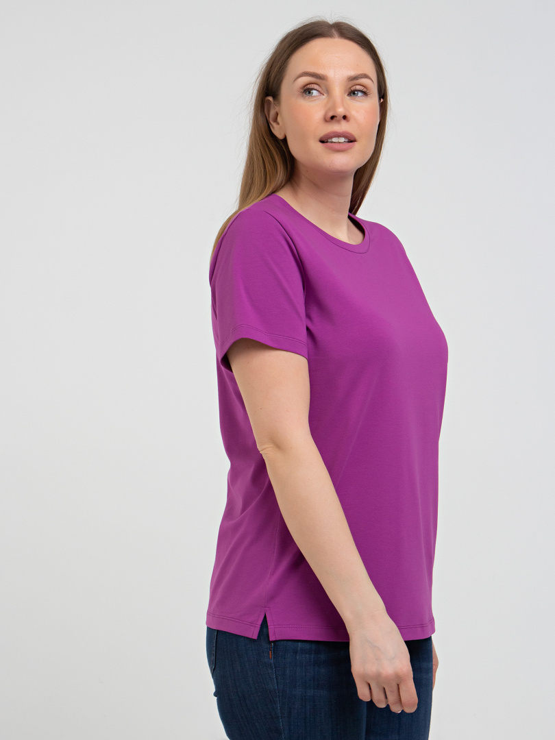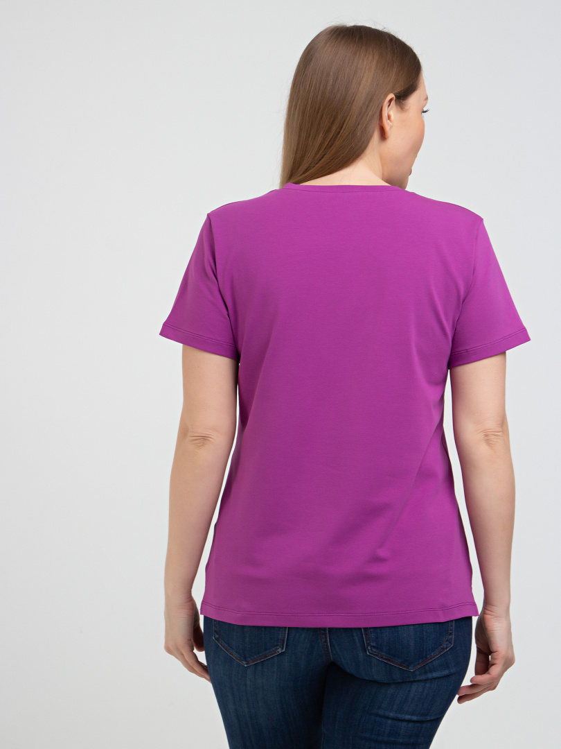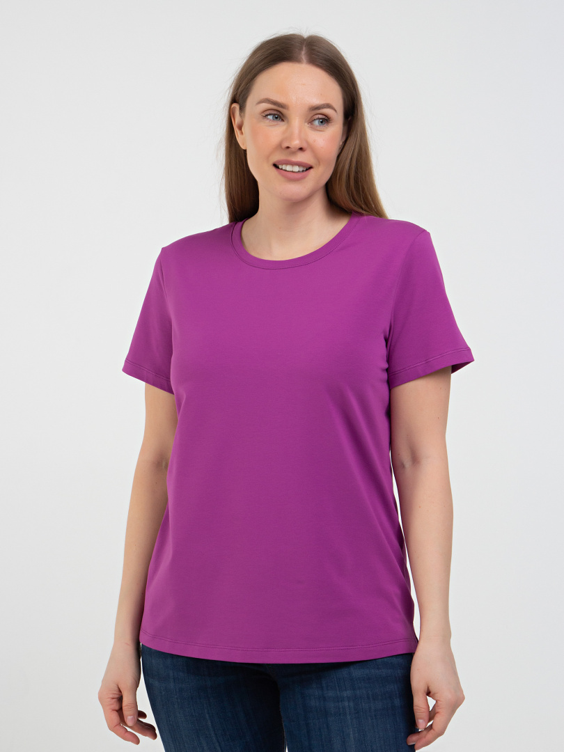 Футболка средней длины прилегающего силуэта из тонкого хлопка с лайкрой. Модель имеет короткий втачной рукав и круглый вырез горловины.
