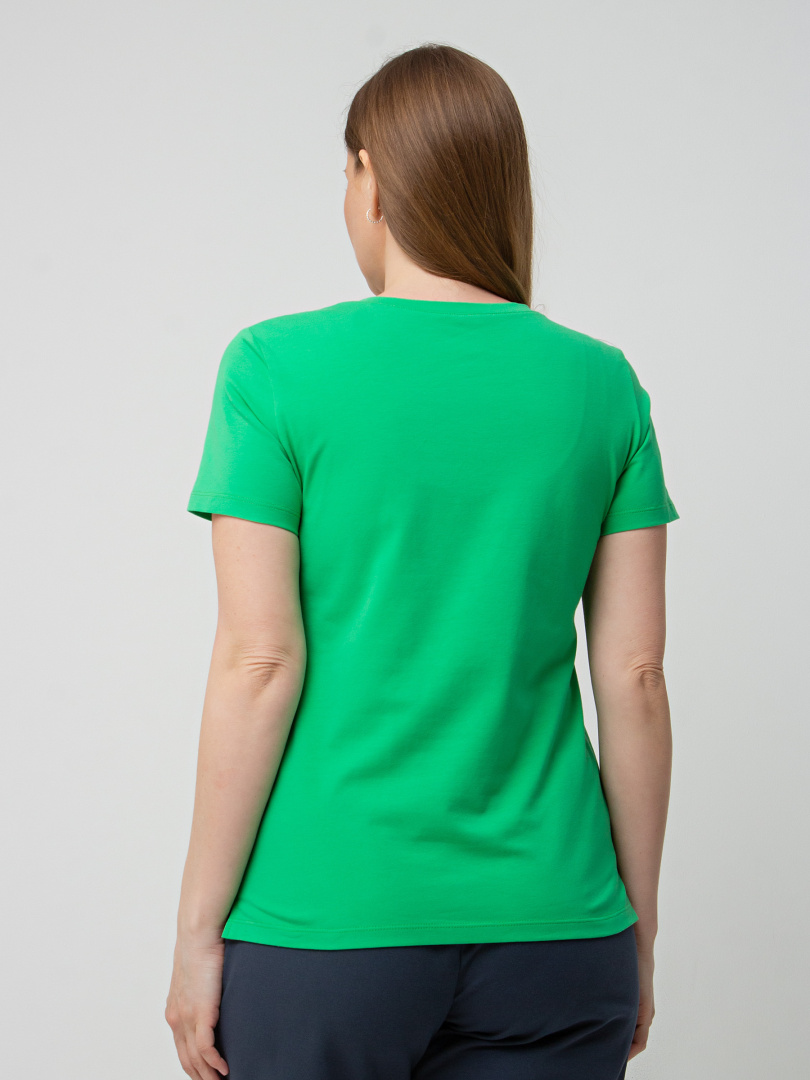 Футболка средней длины прилегающего силуэта из тонкого хлопка с лайкрой. Модель имеет короткий втачной рукав и V-образный вырез горловины.