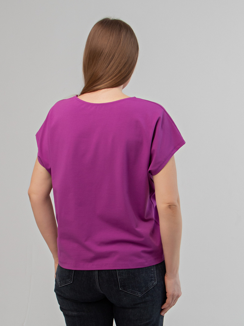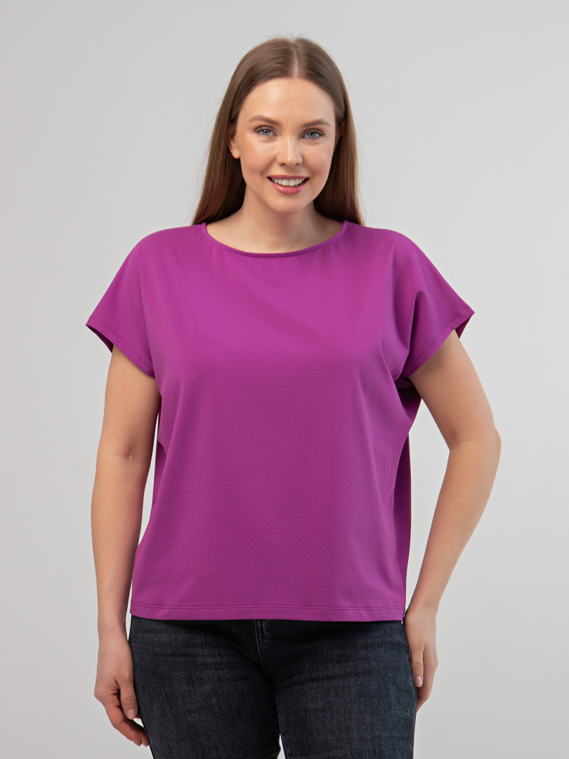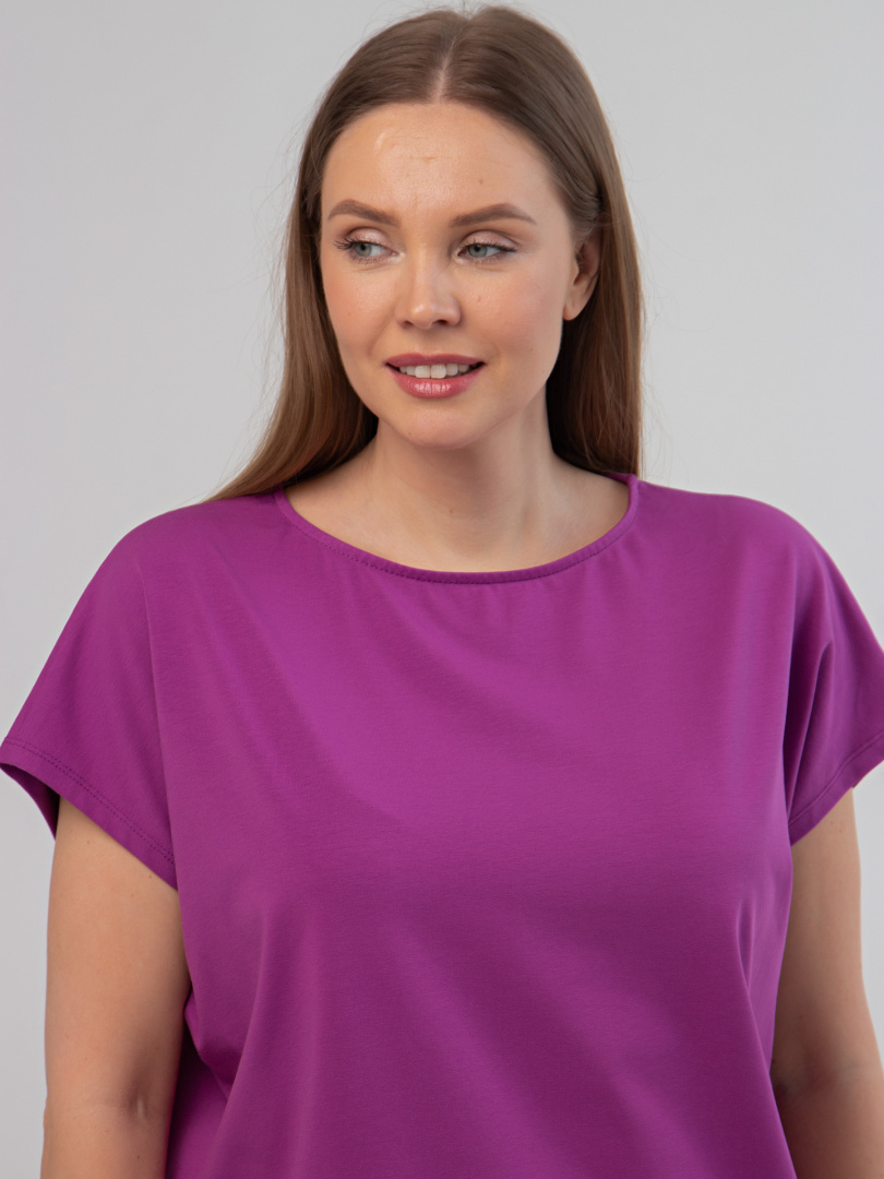 Блуза средней длины, выполнена из трикотажа. Покрой свободный, со спущенным цельнокроеным рукавом. Вырез круглый.