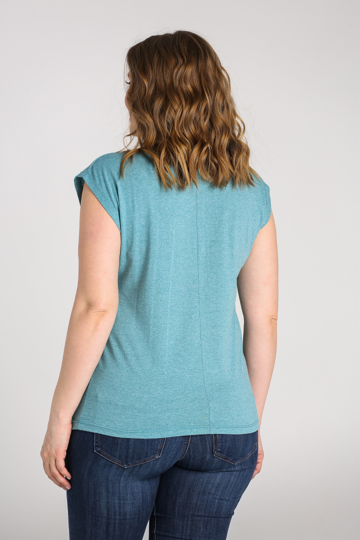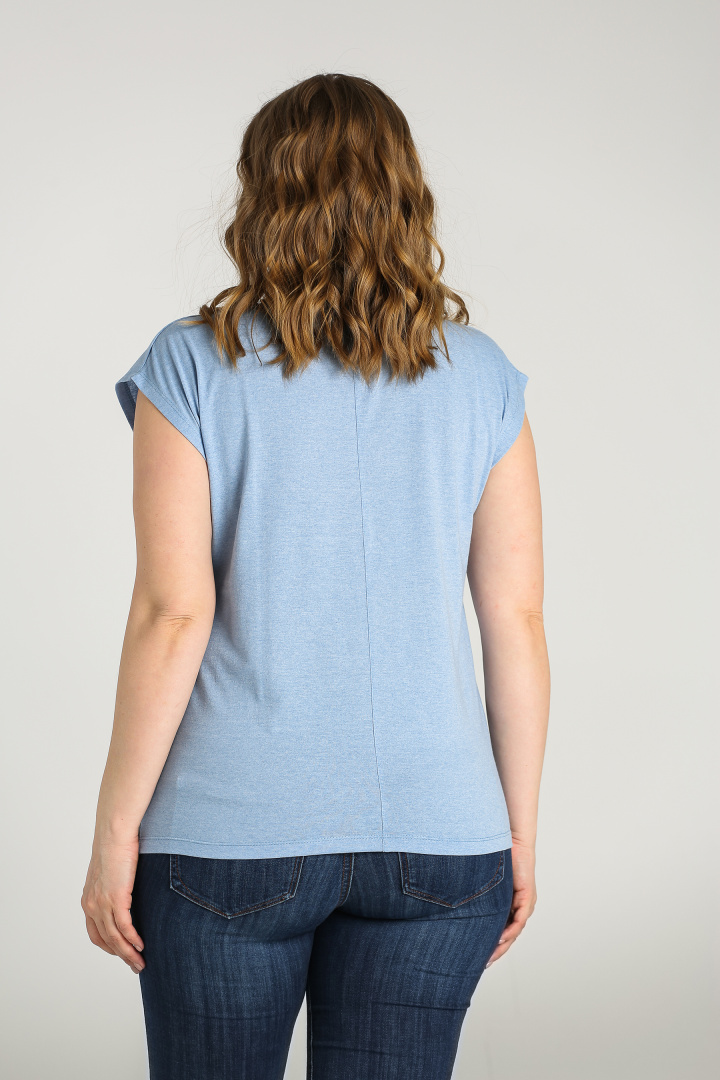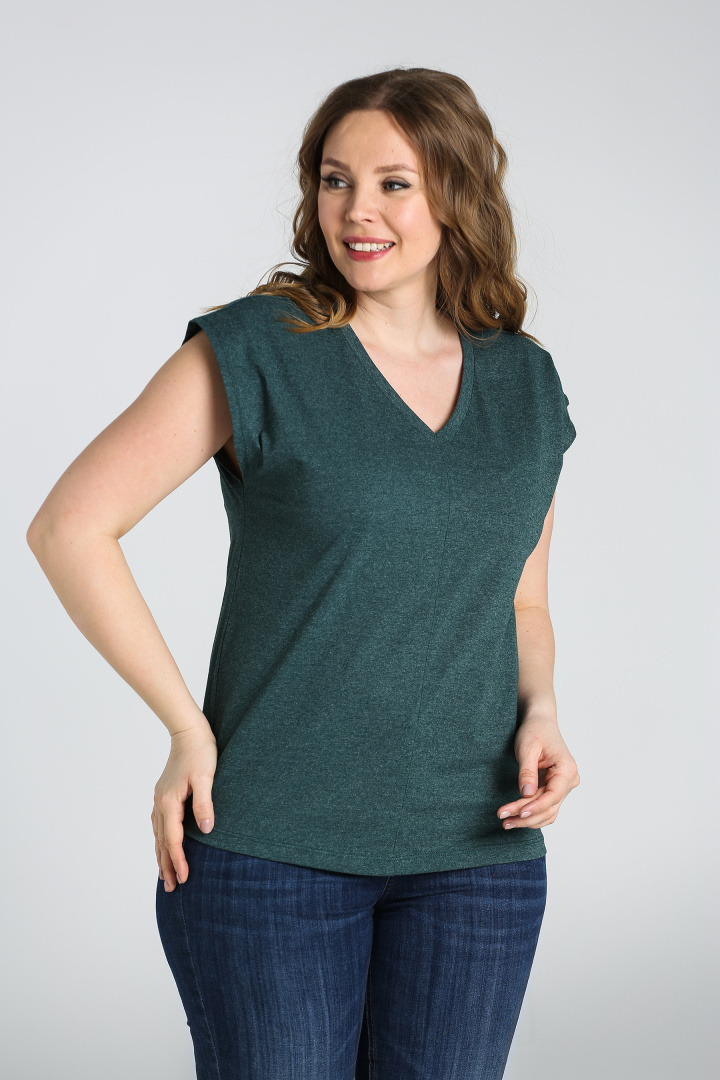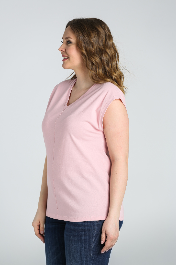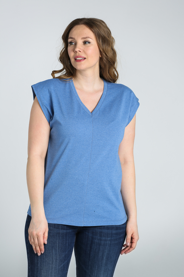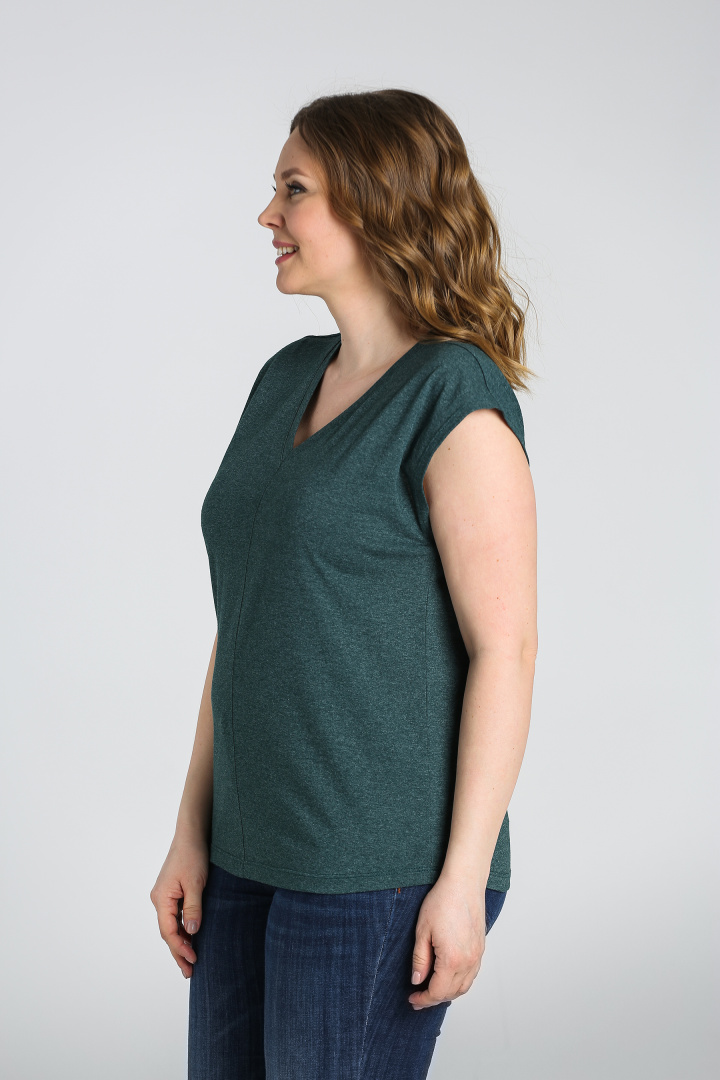 Футболка средней длины, выполнена из трикотажа. Покрой свободный со спущенным цельнокроеным рукавом. Футболка имеет V-образный вырез горловины. Перед и спинка со средним швом с декоративной строчкой.