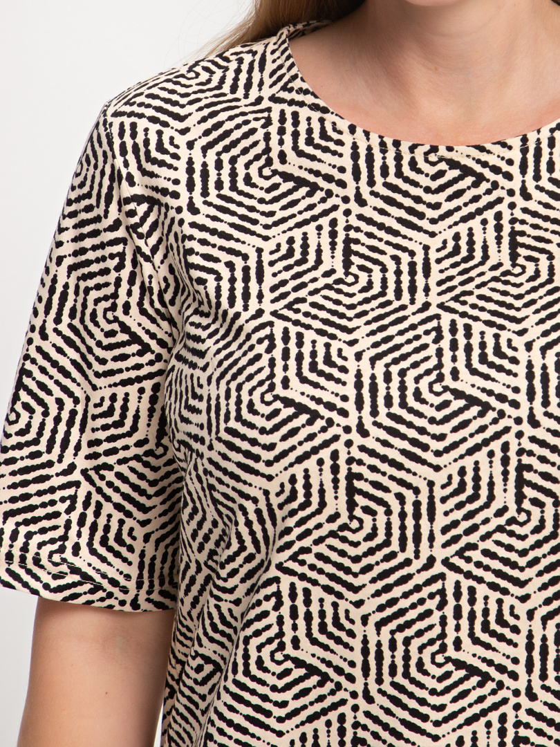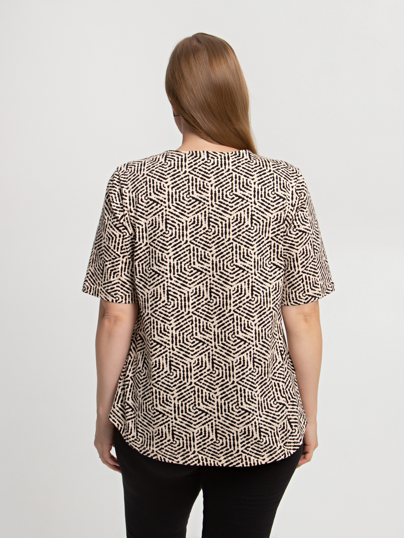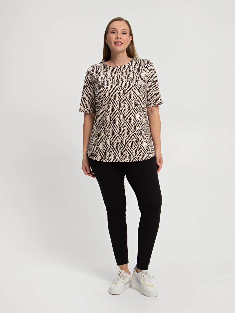 Трикотажная блуза средней длины полуприлегающего силуэта. Модель имеет короткий втачной рукав и фигурную линию низу. Вырез горловины круглый.