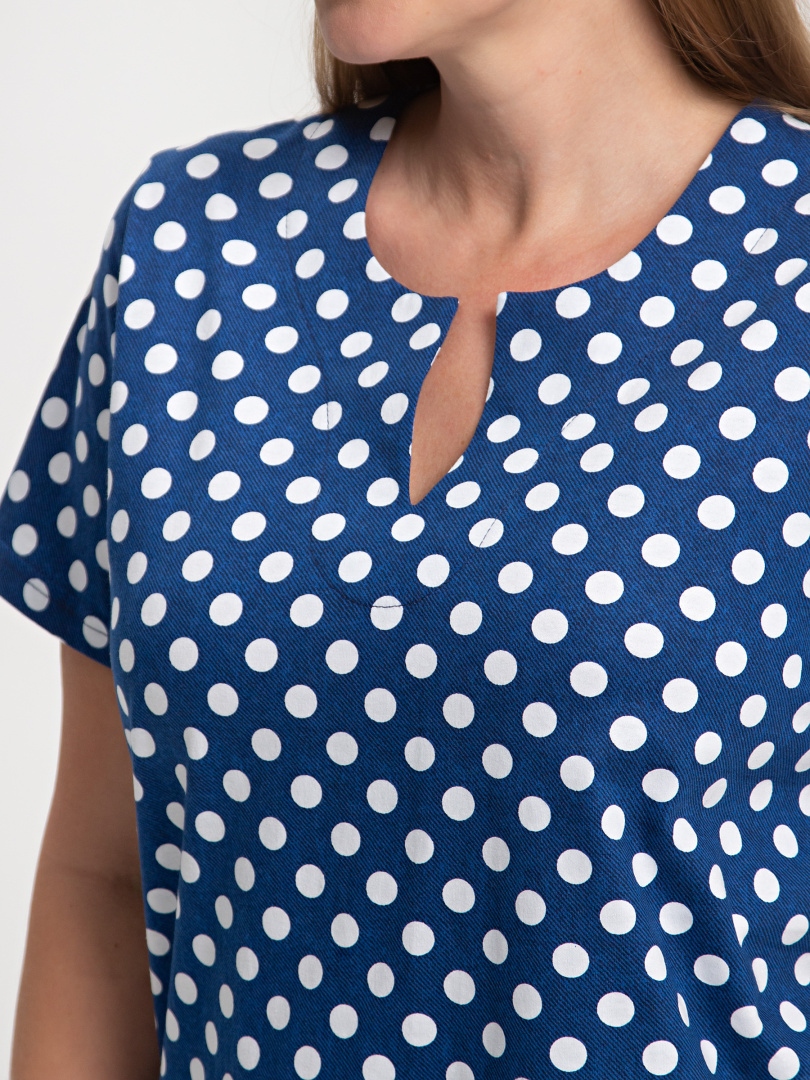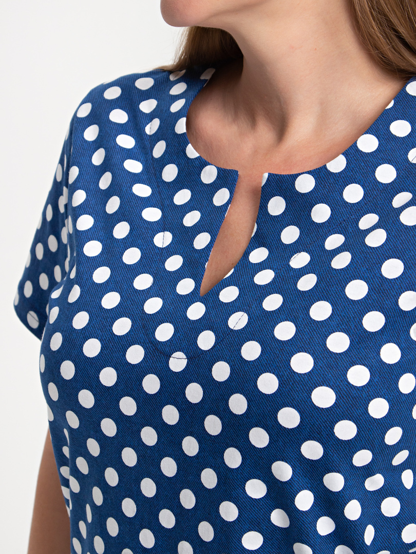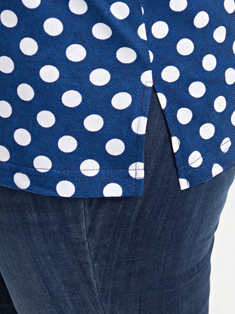 Трикотажная блуза средней длины прямого силуэта. Низ боковых швов оформлен разрезами. Модель имеет короткий втачной рукав и фигурный вырез горловины.