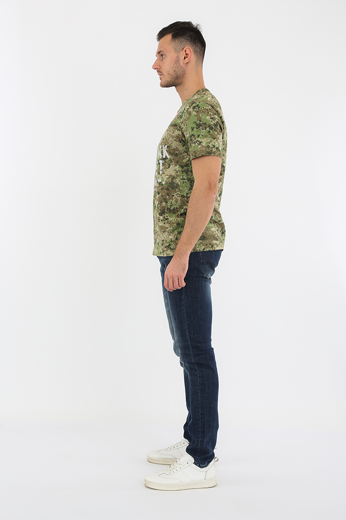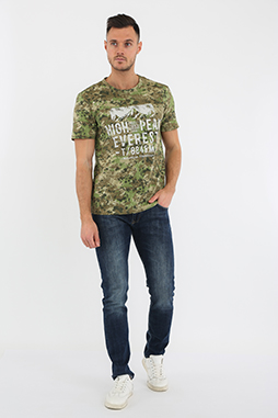 Футболка прямого покроя с круглым вырезом горловины. Базовая модель на каждый день. Перед декорирован принтом.