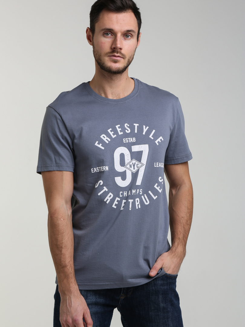Футболка прямого покроя с круглым вырезом. Модель дополнена декоративной печатью. Большие размеры.