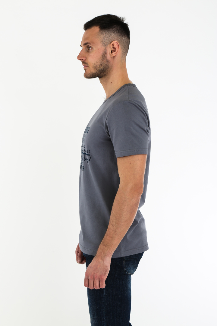 Футболка прямого покроя с круглым вырезом горловины. Базовая модель на каждый день. Перед декорирован принтом.
