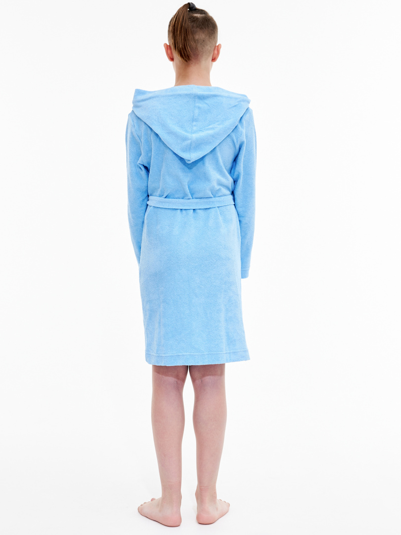Детский трикотажный халат прямого покроя с запахом. Модель с длинным втачным рукавом и капюшоном. Длина изделия - миди. По переду - один накладной карман. Модель дополнена поясом.
