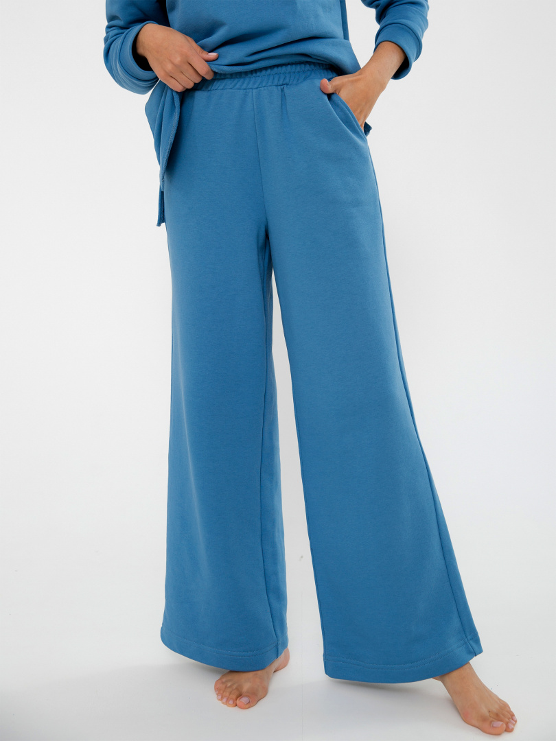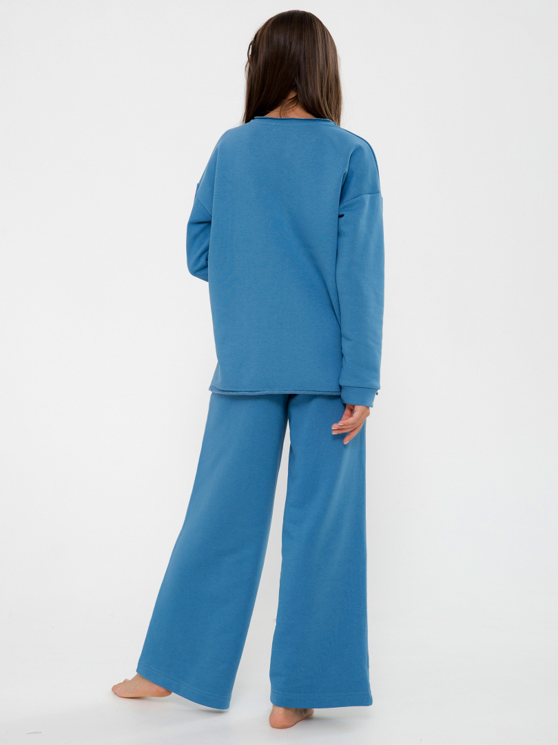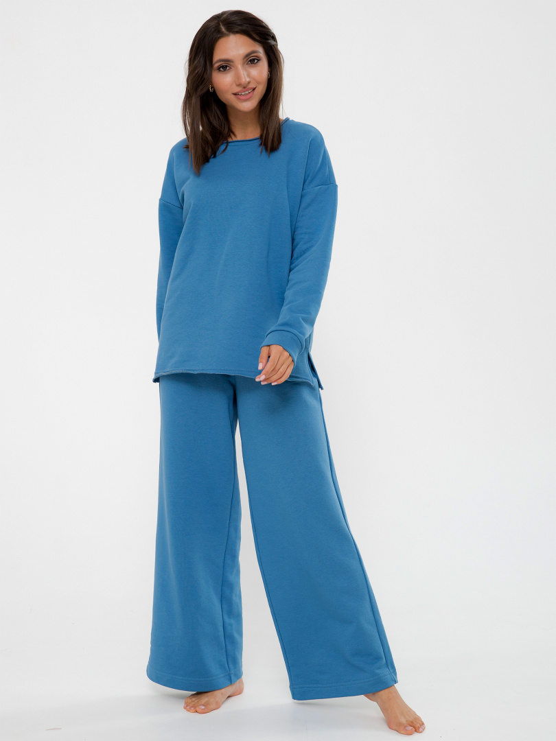 Уютный  женский трикотажный комплект из джемпера и брюк.  Джемпер современного свободного покроя со спущенным плечом. Рукав на манжете, зауженный к низу.  Изделие выполнено из однотонного футера-петля. Модель имеет круглый вырез горловины и разрезы по боковым швам. Низ джемпера – стильный необработанный край. Длинные брюки современного прямого покроя.  Притачной пояс с широкой резинкой.  На передних половинках боковые  карманы с наклонным входом.  Комплект идеален для повседневной носки.