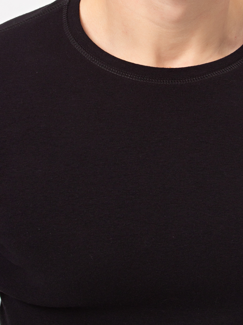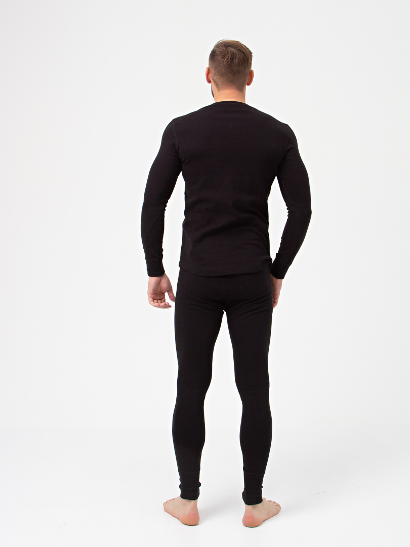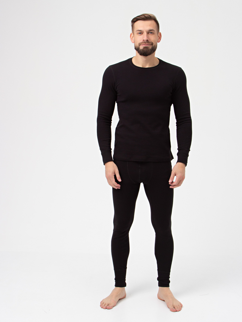 Мужской комплект термобелья состоит из джемпера и кальсон. Джемпер средней длины прилегающего силуэта с удлиненной спинкой. Рукав втачной длинный на манжете. Небольшой круглый вырез горловины. Кальсоны прилегающего покроя на манжете внизу.