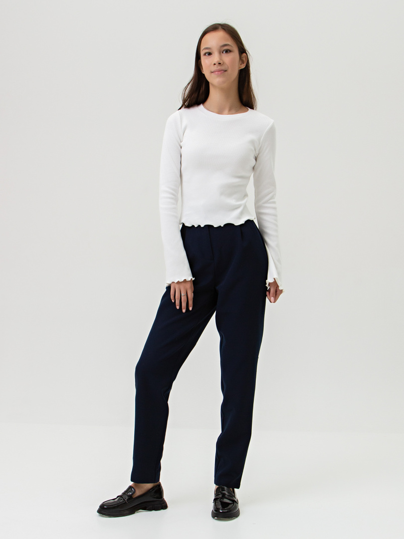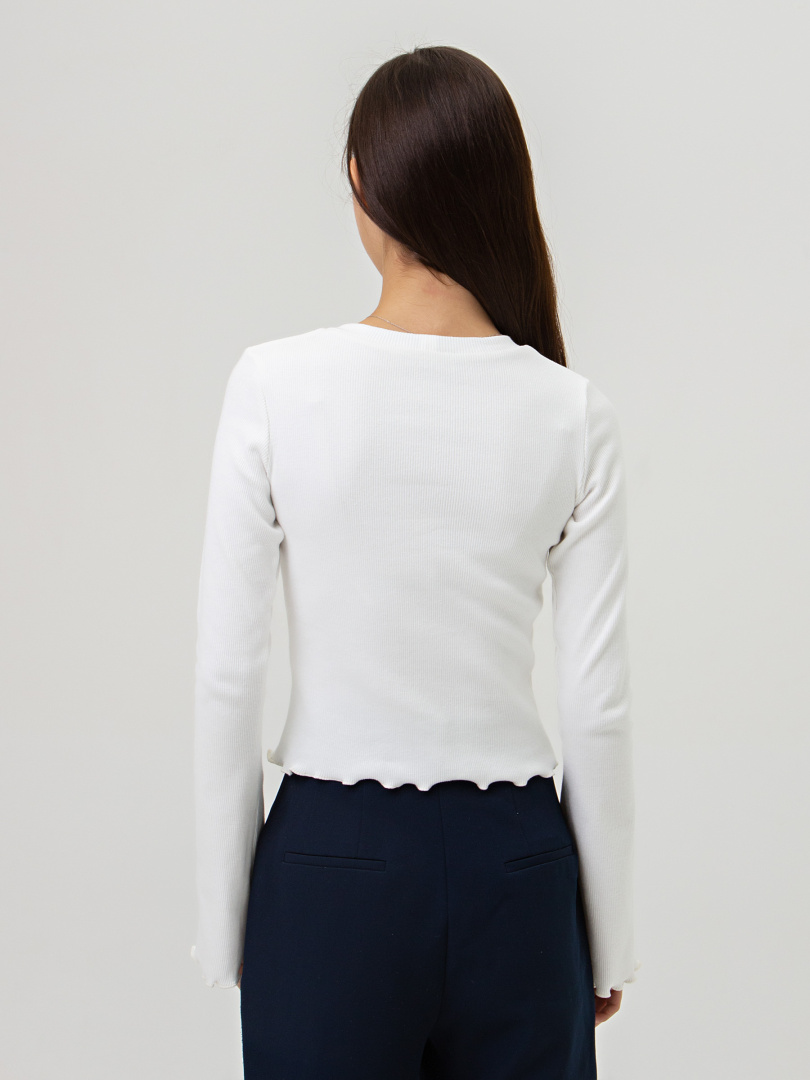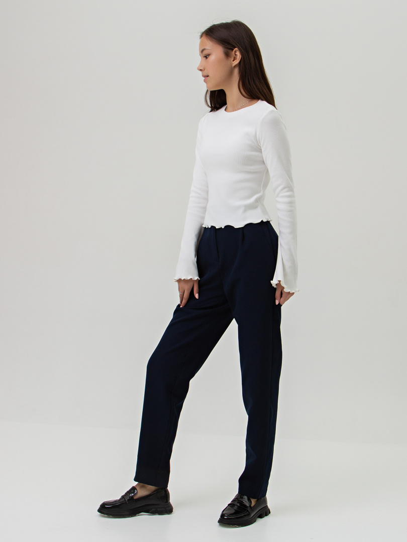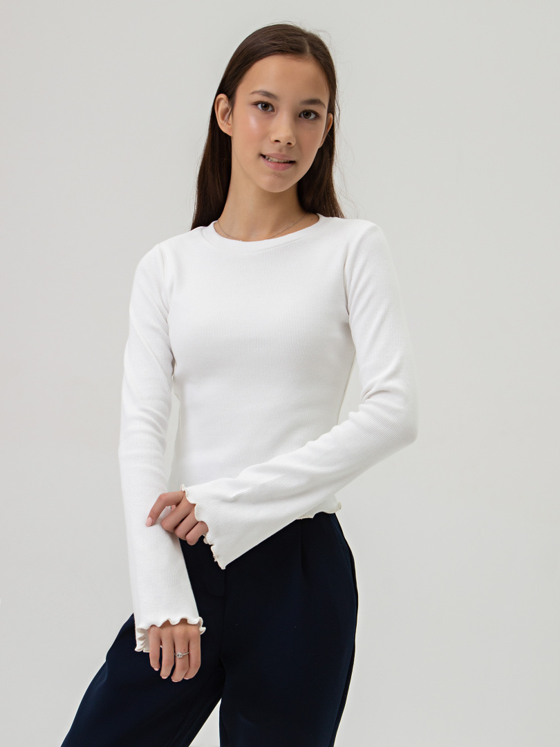 Укороченный джемпер из эластичного трикотажа. Силуэт ¬прямой прилегающий. Горловина круглая. Длинный рукав расклешен к низу.