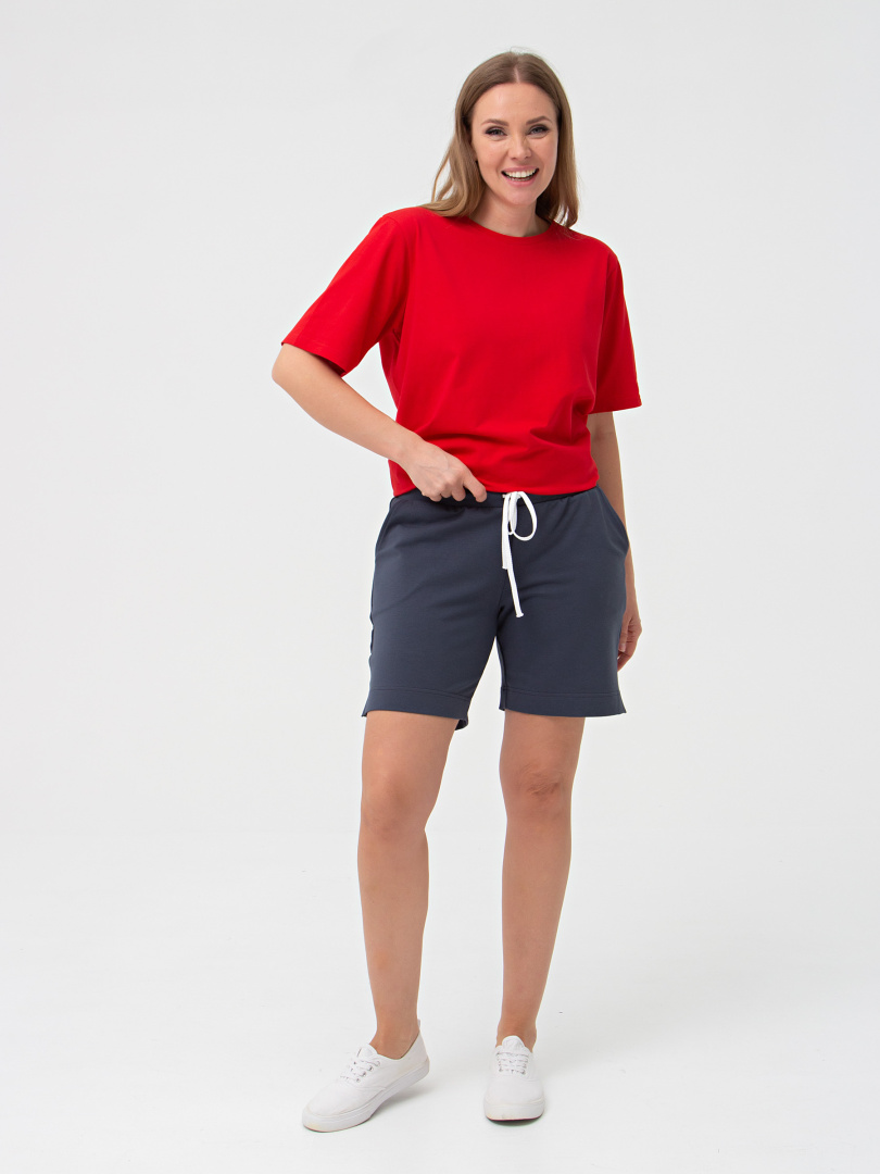 Шорты средней длины, выполненные из плотного трикотажного полотна - футер. Модель с удобной средней посадкой. Пояс на широкой резине со шнуром. На передних половинках боковые карманы с наклонным входом. По боковым швам – небольшие разрезы.