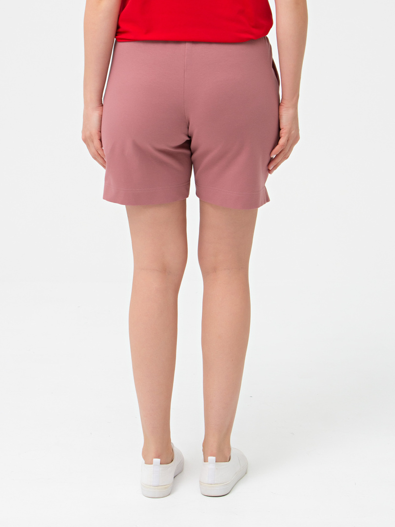 Шорты средней длины, выполненные из плотного трикотажного полотна - футер. Модель с удобной средней посадкой. Пояс на широкой резине со шнуром. На передних половинках боковые карманы с наклонным входом. По боковым швам – небольшие разрезы.