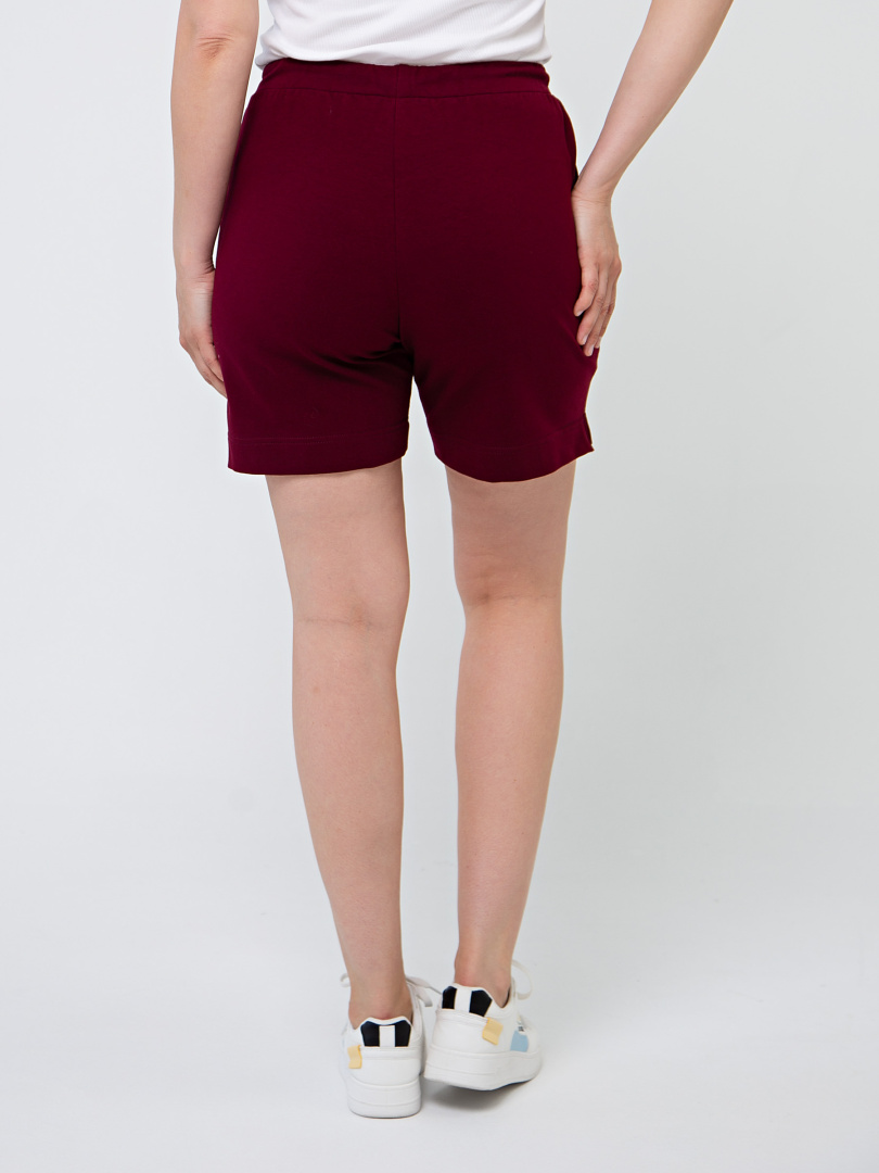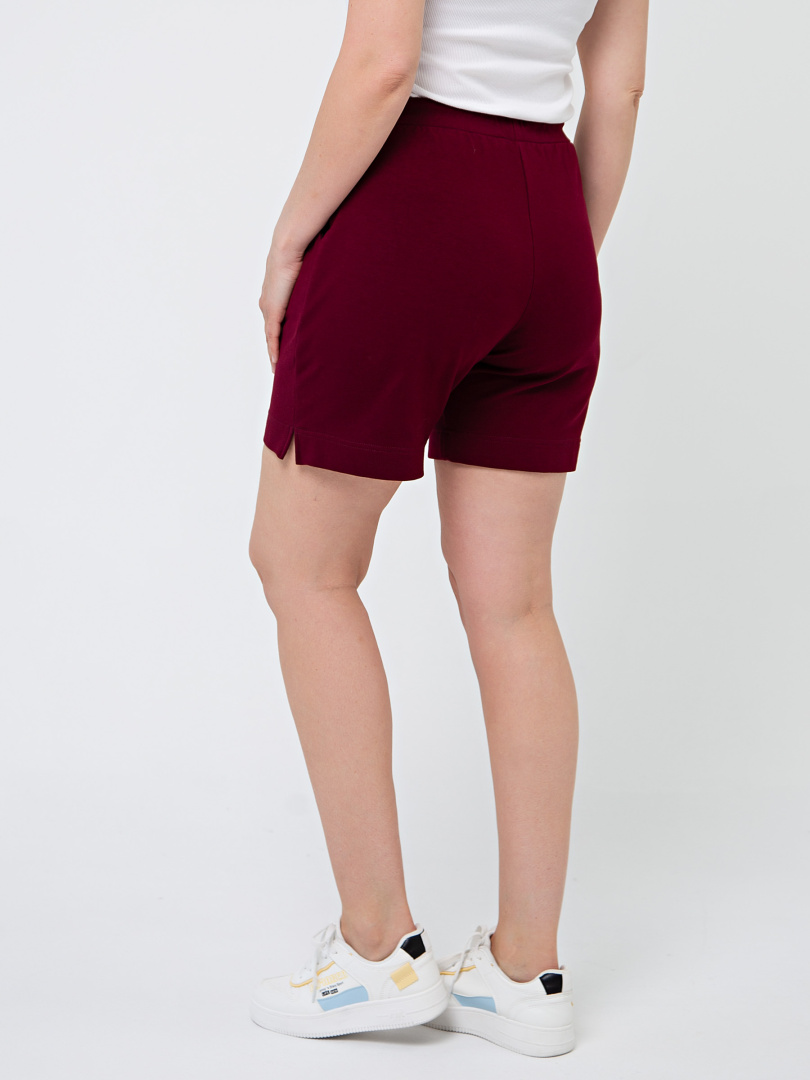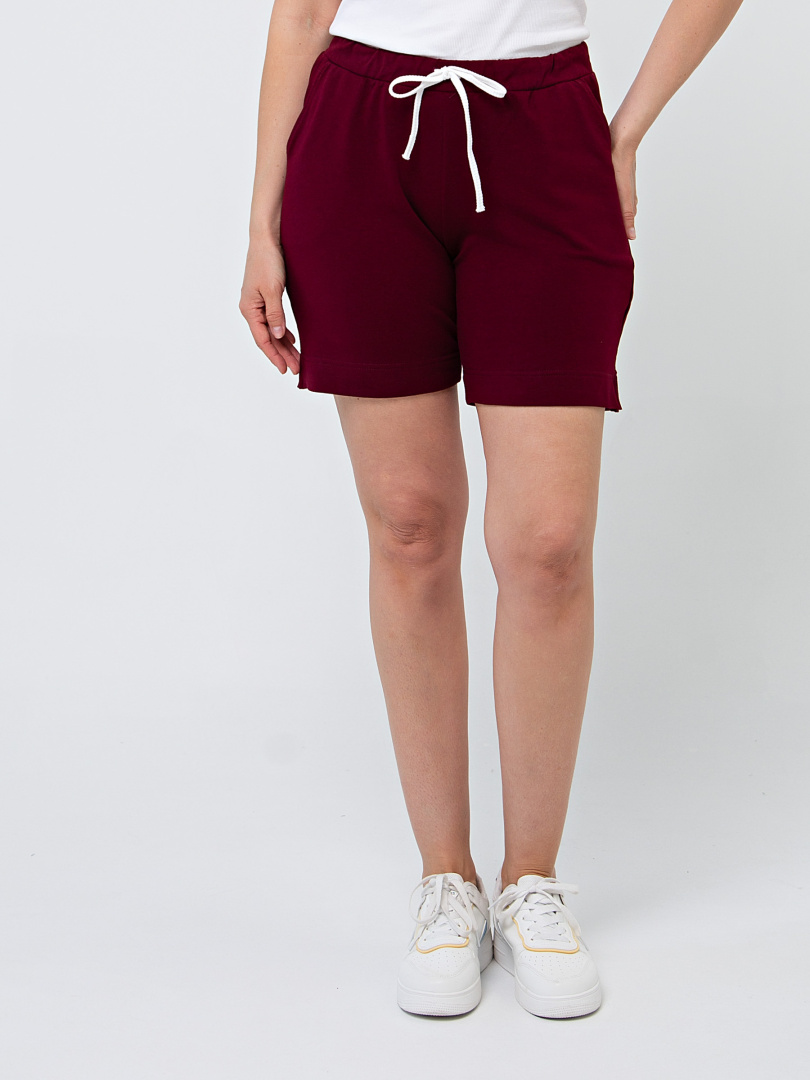 Шорты средней длины, выполненные из плотного трикотажного полотна - футер. Модель с удобной средней посадкой. Пояс на широкой резине со шнуром. На передних половинках боковые карманы с наклонным входом. По боковым швам – небольшие разрезы.