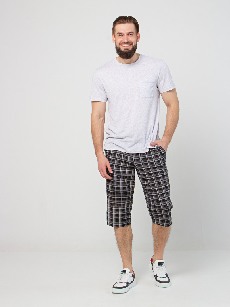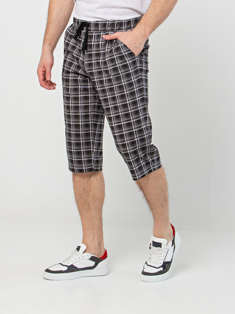 Хлопковые трикотажные бриджи длиной до середины икры. Модель прямого покроя слегка заужена книзу. Притачной пояс с широкой резинкой и шнуром. На передней половинке боковые карманы.