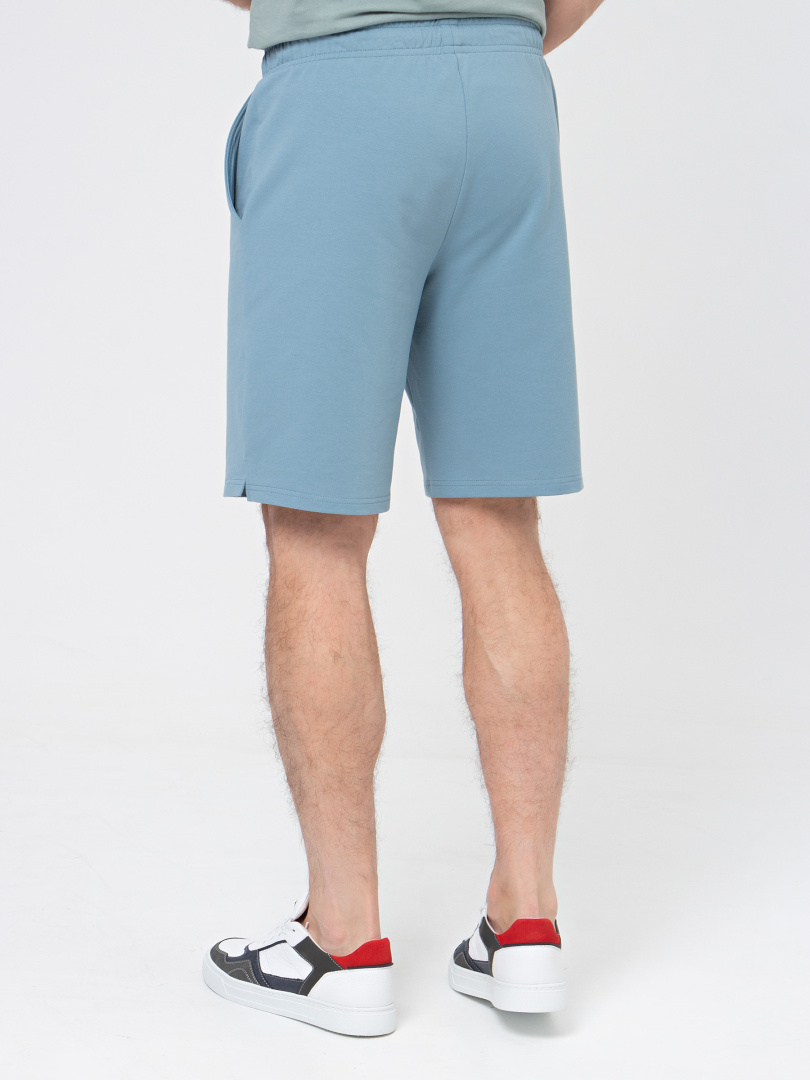 Шорты средней длины, выполненные из плотного трикотажного полотна - футер. Модель с удобной средней посадкой. Пояс на широкой резине со шнуром.  На передних половинках боковые карманы с наклонным входом. По боковым швам – небольшие разрезы. На передней половинке брюк – декоративная печать.
