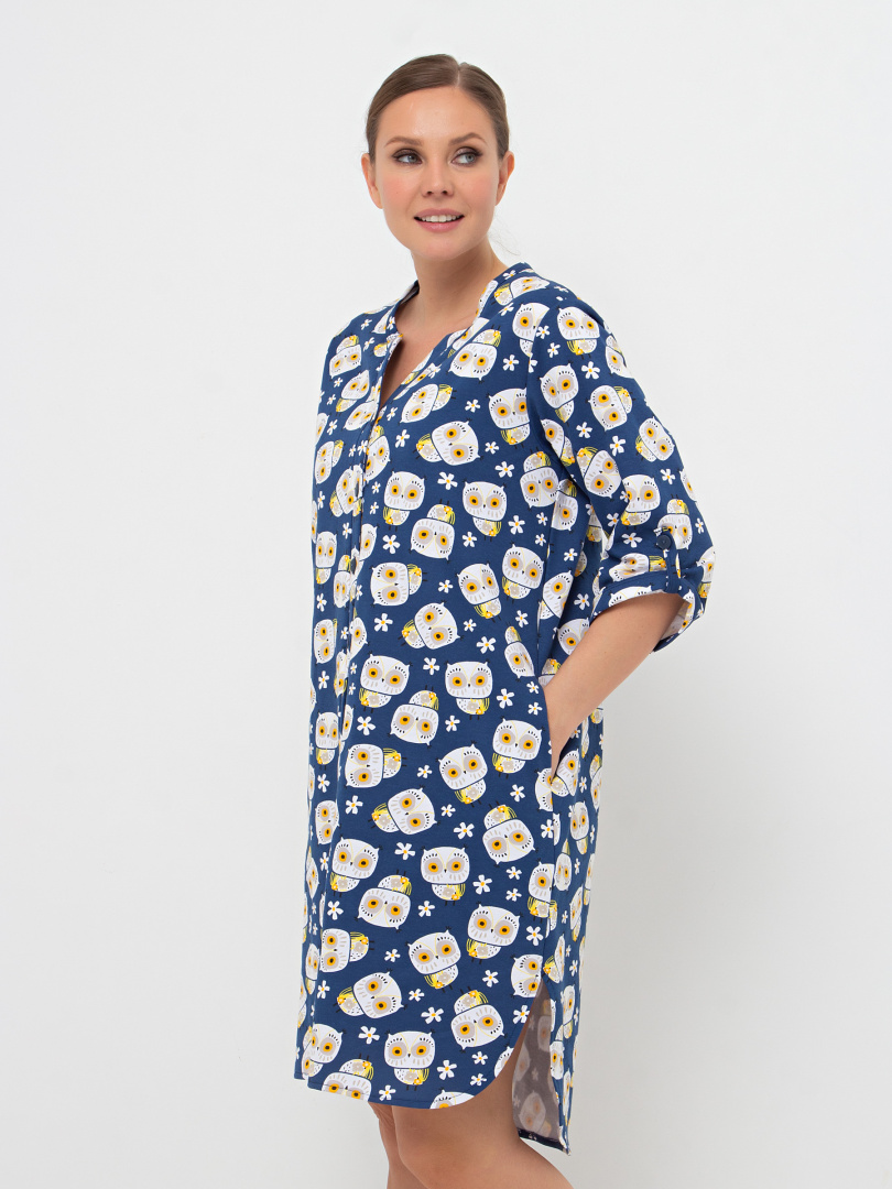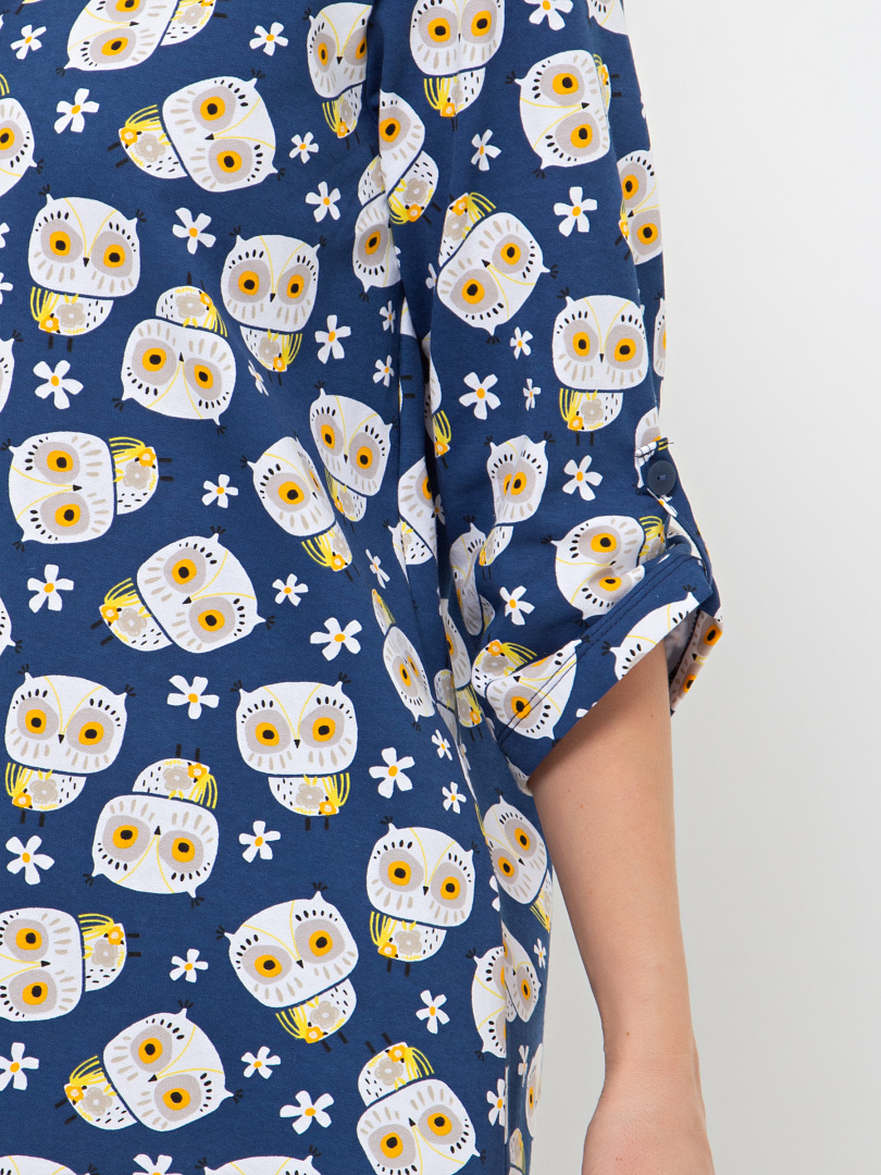 Женская трикотажная туника свободного рубашечного покроя с втачным рукавом длиной 3/4. По низу рукава – паты, застегивающиеся на пуговицу. Пата дает возможность регулировать длину рукава. Длина изделия – миди. У модели удлиненная спинка и боковые разрезы с закругленными краями. По спинке туника имеет кокетку. Изделие с застежкой на планке.