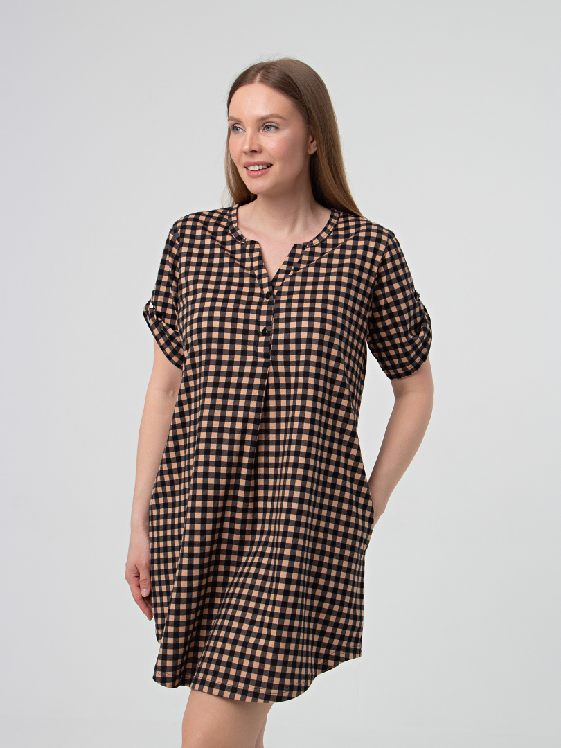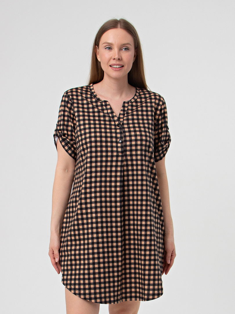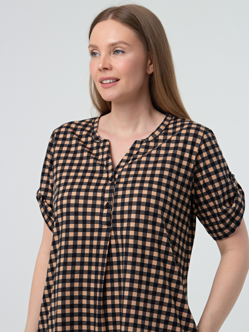 Туника выполнена из хлопкового трикотажа. Модель полуприлегающего силуэта с фигурным низом. Изделие с коротким рукавом.  По низу рукава – пата с застёжкой на пуговицу. Круглый вырез имеет косую планку с застёжкой на 2 пуговицы. По низу планки – складка. В боковых швах – внутренние карманы.
