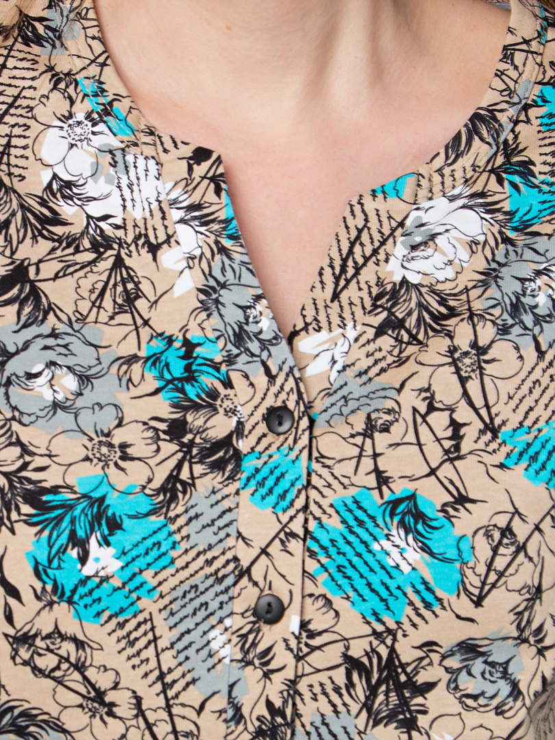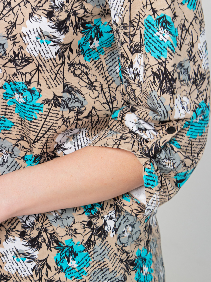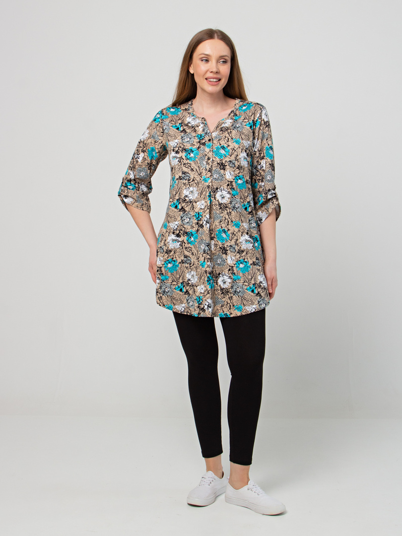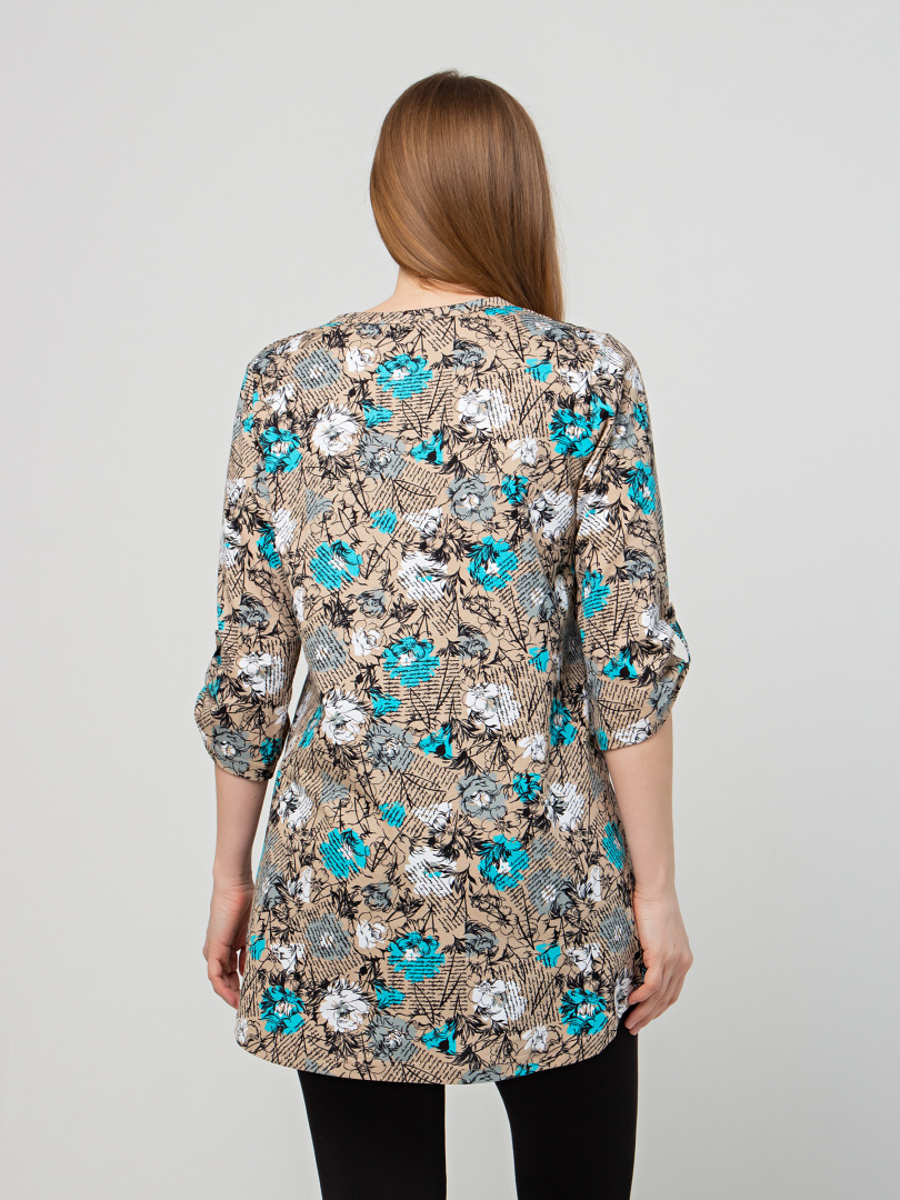 Туника выполнена из хлопкового трикотажа. Модель полуприлегающего силуэта с фигурным низом. Изделие с втачным ¾ рукавом. По низу рукава – пата с застёжкой на кнопку. Круглый вырез имеет косую планку с застёжкой на 2 кнопки.