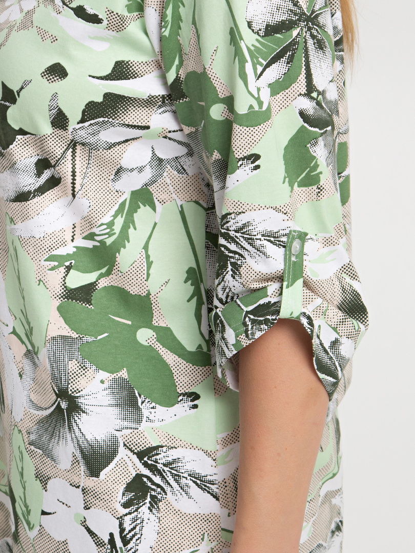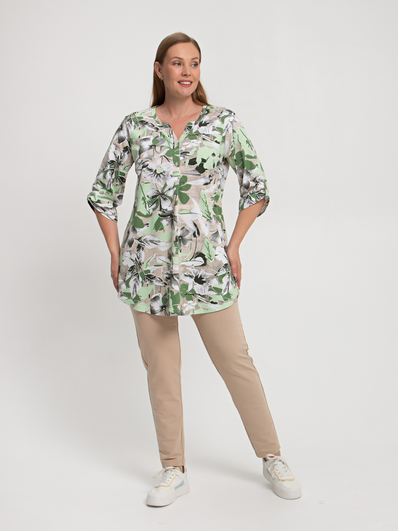 Туника выполнена из хлопкового трикотажа. Модель полуприлегающего силуэта с фигурным низом. Изделие с втачным ¾ рукавом. По низу рукава – пата с застёжкой на кнопку. Круглый вырез имеет косую планку с застёжкой на 2 кнопки.