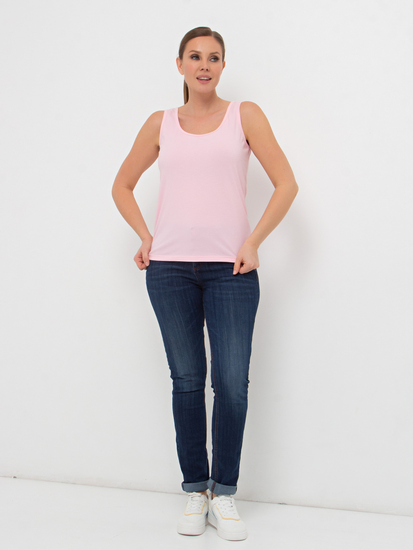 Майка из тонкого хлопка с лайкрой. Модель приталенного покроя. По пройме и горловине окантовка из того же материала. В левый боковой шов вшит «флажок» из отделочной ткани.