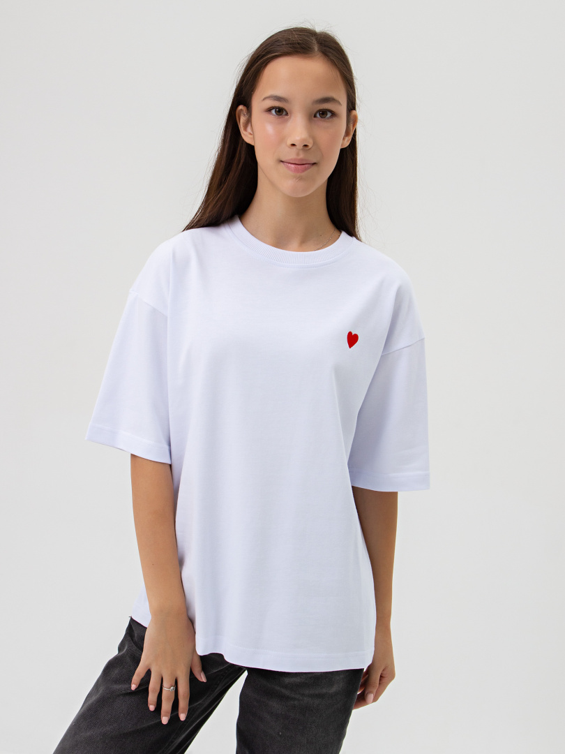 Фуфайка средней длины выполнена из плотного трикотажа. Покрой свободный с втачным коротким рукавом со спущенным плечом. Вырез круглый.